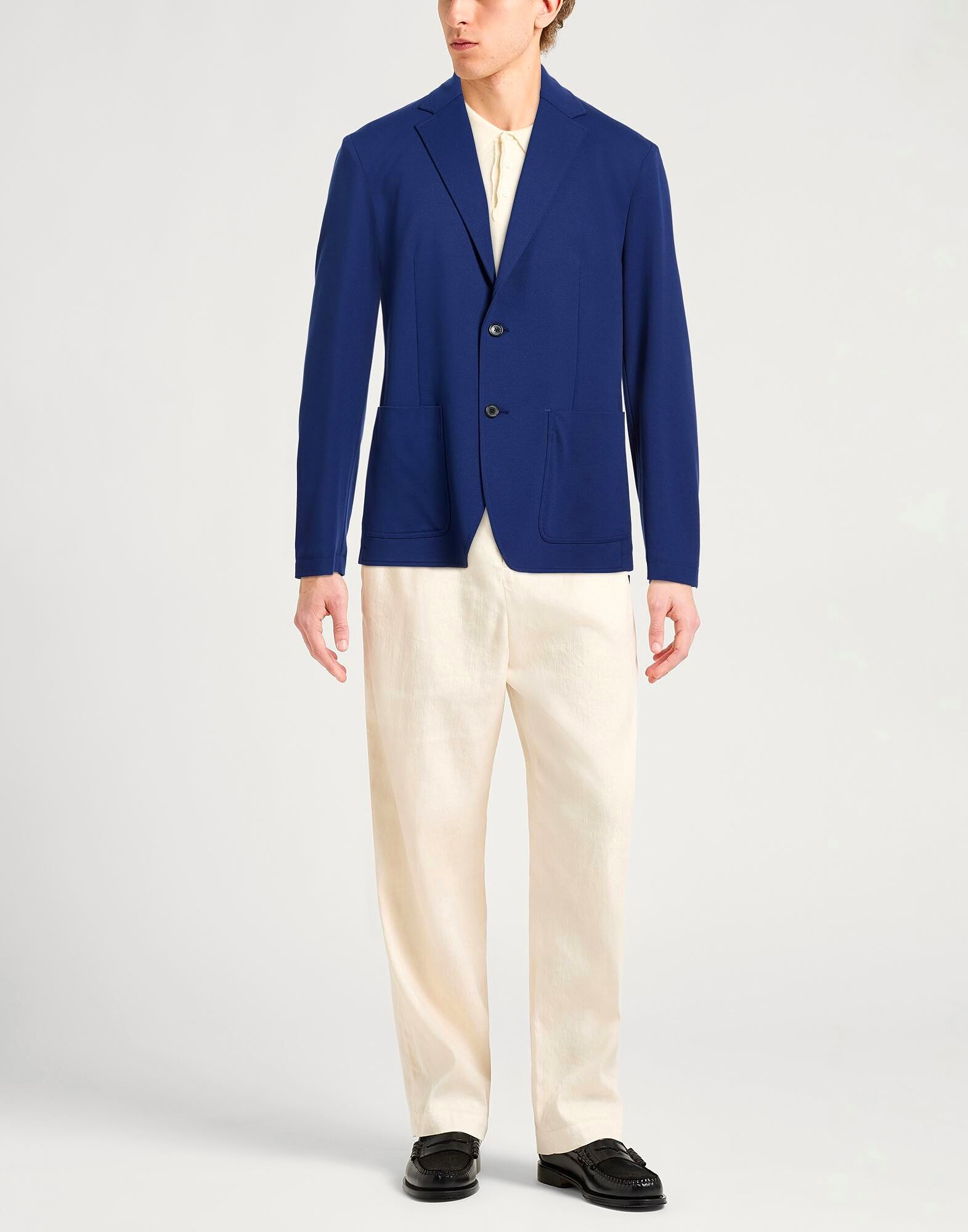 Трикотажная ткань, логотип бренда, однотонный цвет, воротник с лацканами, длинные рукава, без подкладки, застежка на пуговицы, множество карманов, эластичная ткань, содержит нетекстильные части животного происхождения, химчистка, не отбеливать, не сушить в сушильной машине, однобортный блейзер