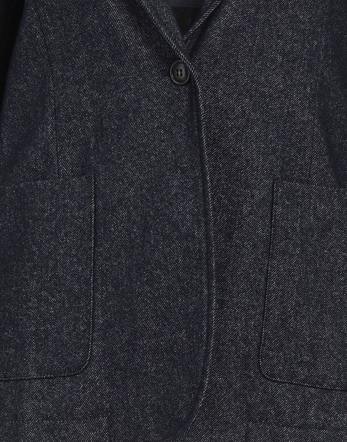 Джинсовая ткань, без аппликаций, однотонный цвет, воротник с лацканами, длинные рукава, без подкладки, застежка на пуговицы, несколько карманов, разрез сзади, химчистка, не отбеливать, не сушить в сушильной машине, однобортный блейзер