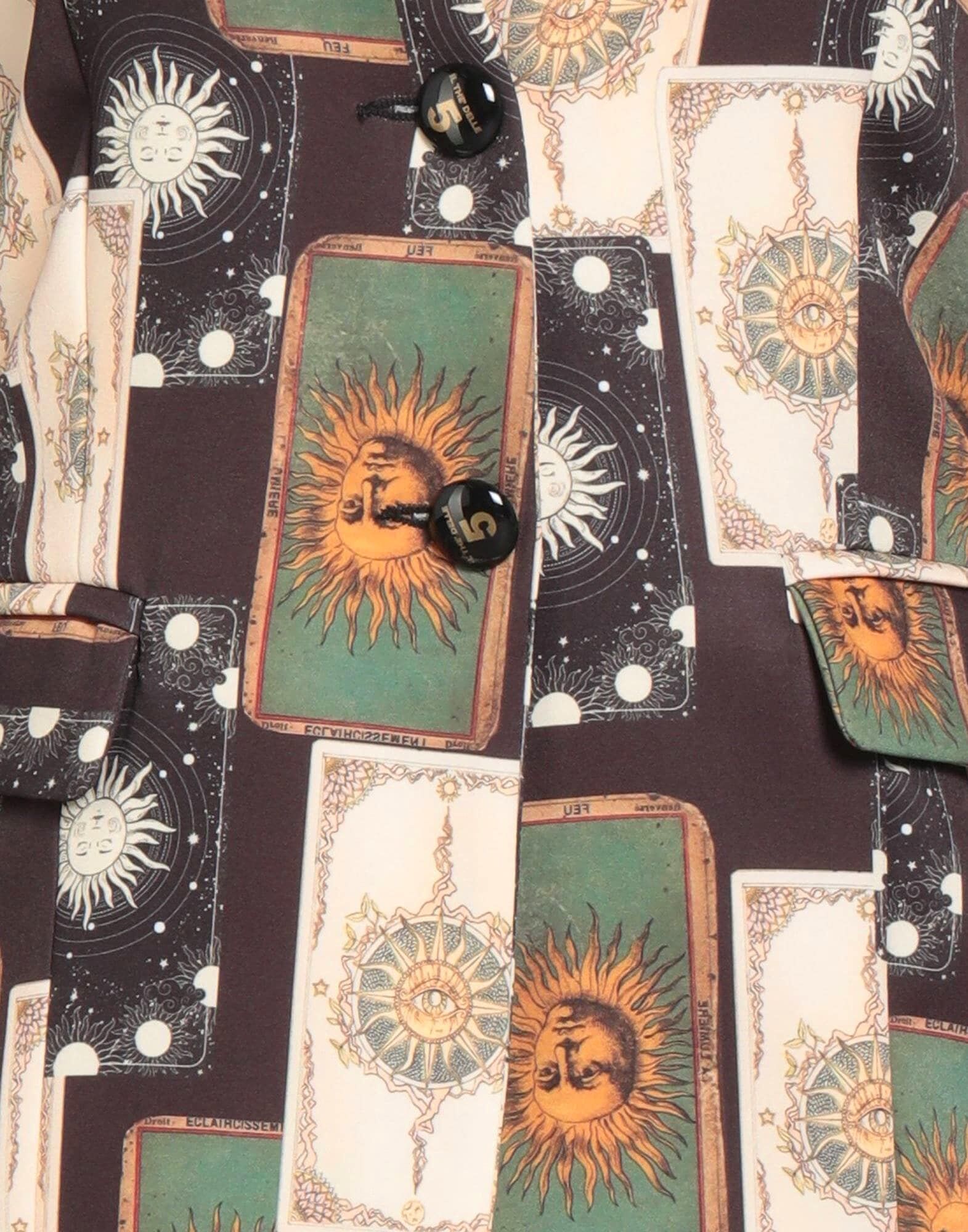 Однобортный блейзер, атлас, эластичная ткань, многоцветный, без аппликаций, V-образный вырез, длинные рукава, подплечники, полностью на подкладке, застежка на пуговицы, один нагрудный карман, накладные карманы, машинная стирка, не отбеливать, не сушить в сушильной машине