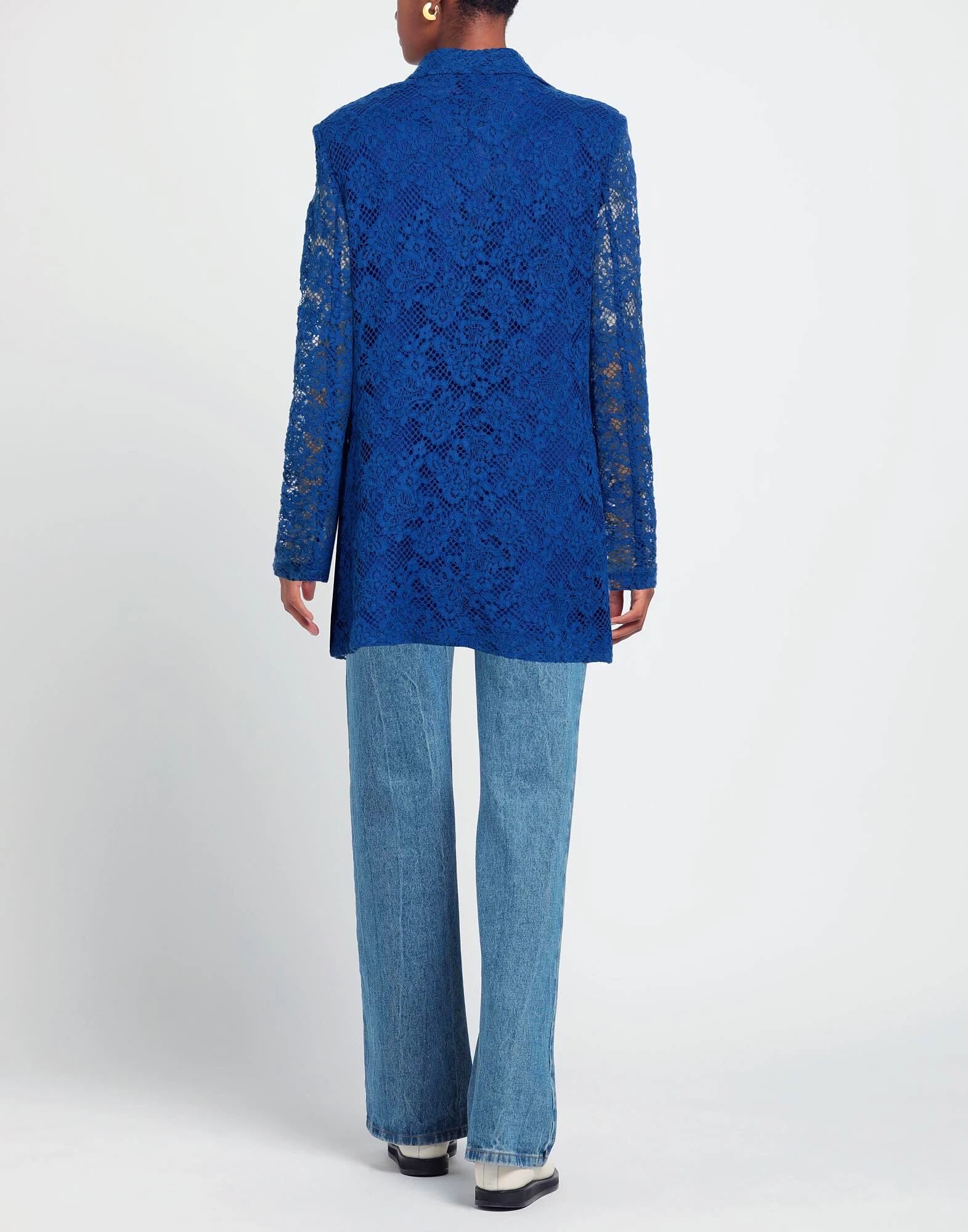Кружево, простое переплетение, ажурная работа, без аппликаций, однотонный цвет, воротник с лацканами, двубортный, длинные рукава, частично на подкладке, застежка на пуговицы, два нагрудных кармана, карман с клапаном, двубортный пиджак