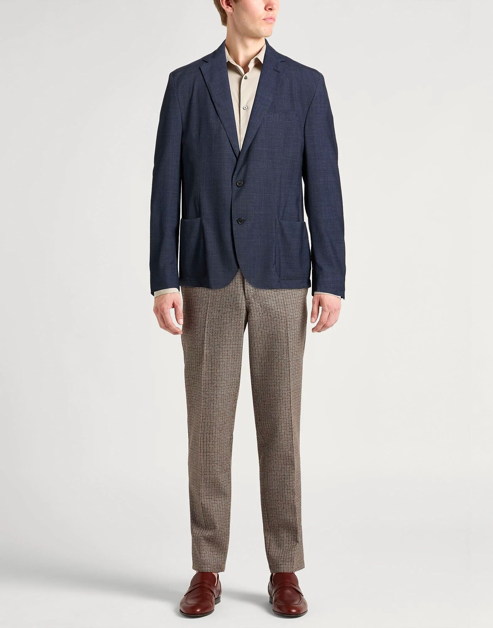 Однобортный блейзер, холодная шерсть, клетка «гусиная лапка», без аппликаций, воротник с лацканами, длинные рукава, частичная подкладка, застежка на пуговицы, накладные карманы, один нагрудный карман, машинная стирка или химчистка, не отбеливать, не сушить в сушильной машине Создайте идеальный образ с этим дизайнерским блейзером, подходящим для деловых встреч или особых случаев