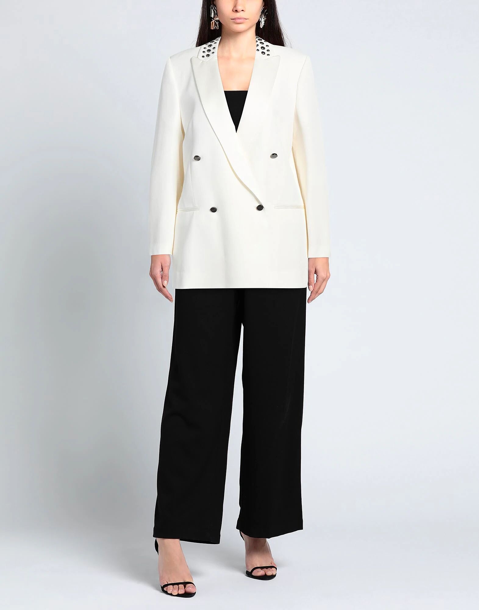 Креп, атлас, логотип бренда, металлические аппликации, однотонный цвет с аппликациями, воротник с лацканами, двубортный, длинные рукава, полностью на подкладке, застежка на пуговицы, без карманов, двубортный пиджак