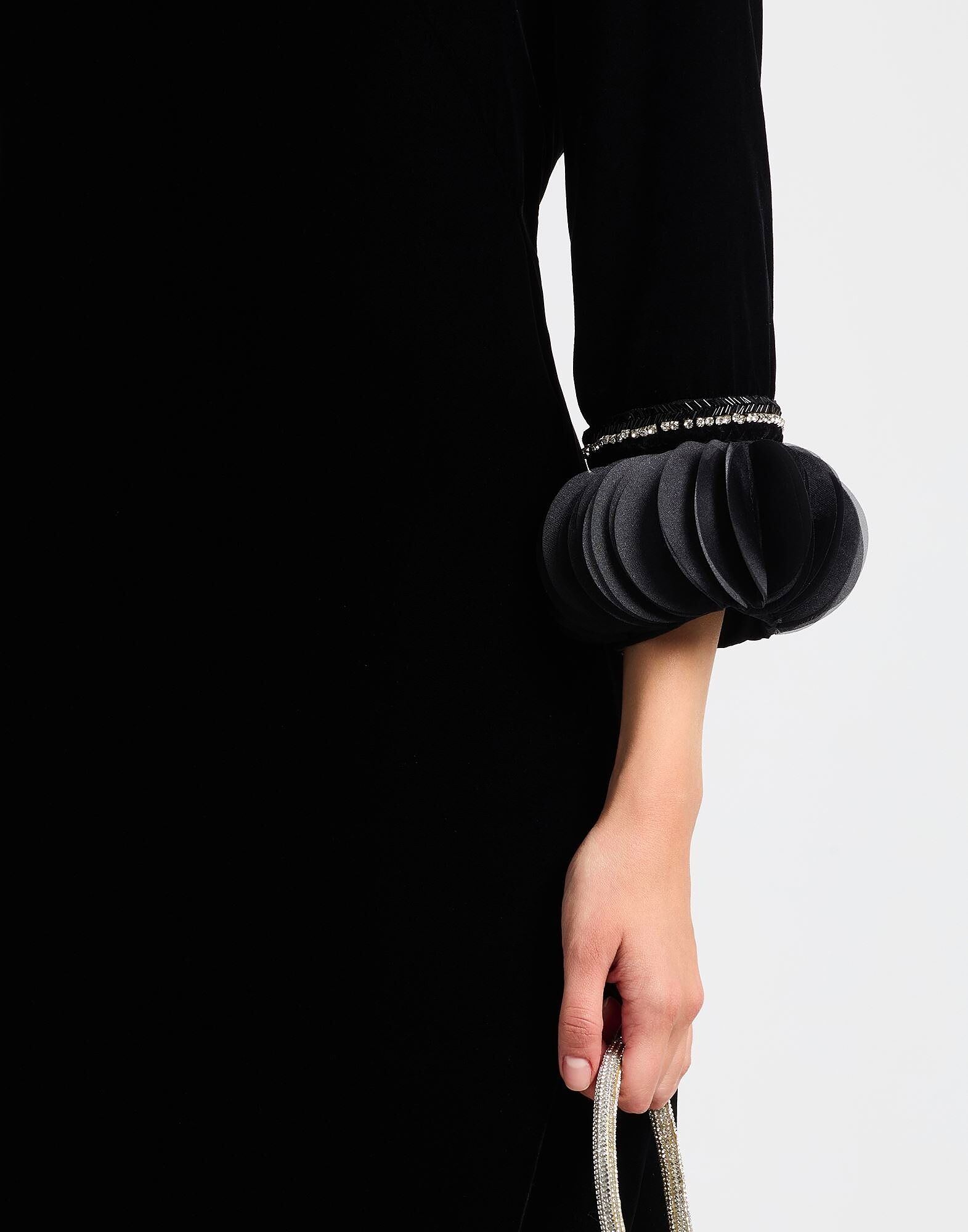 Платье-клеш, бархат, однотонное, с аппликациями, кристаллами, V-образный вырез, длинные рукава, полностью на подкладке, застежка-молния, без карманов, химчистка, не отбеливать, не сушить в сушильной машине