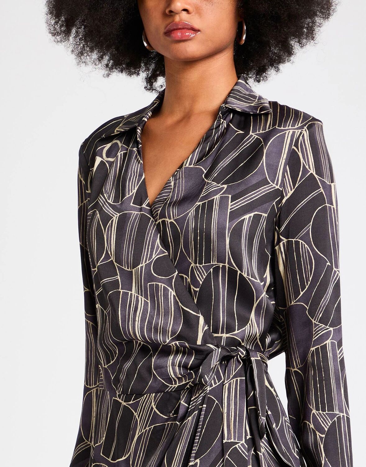 Платье-халат, атлас, геометрический принт, логотип бренда, V-образный вырез, длинные рукава, частичная подкладка, завязка, машинная стирка, не отбеливать, не сушить в сушильной машине