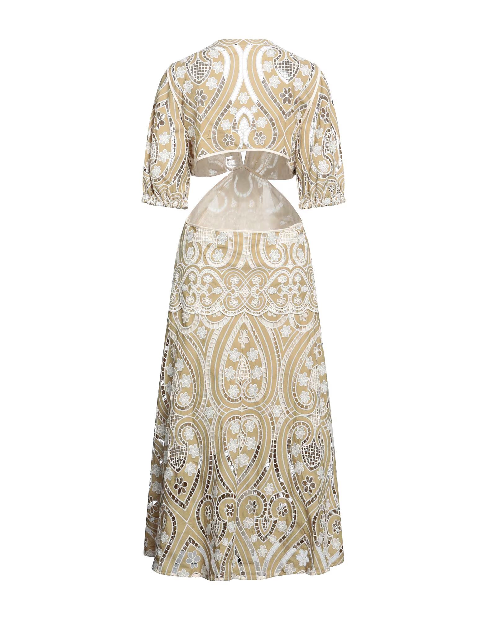 Платье из ткани, кружева, с вышивкой, с цветочным принтом, глубоким вырезом, рукавами 3/4, на подкладке, застежкой-молнией, застежками-кнопками, без карманов, расклешенное