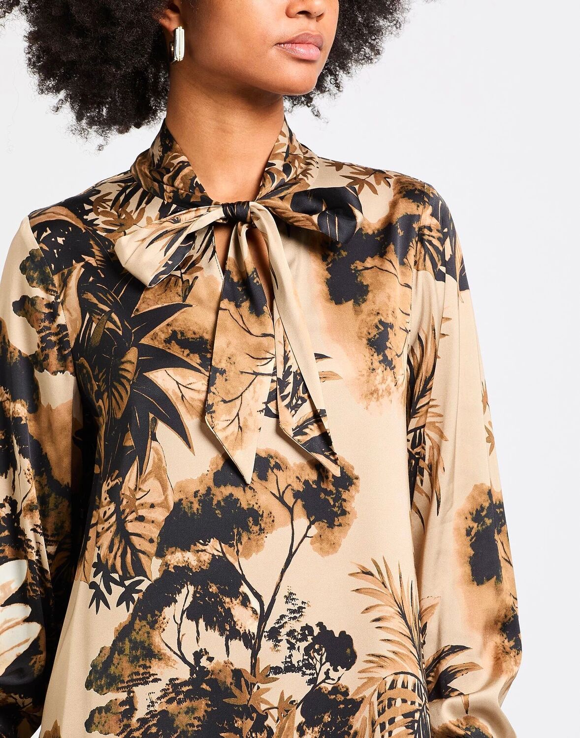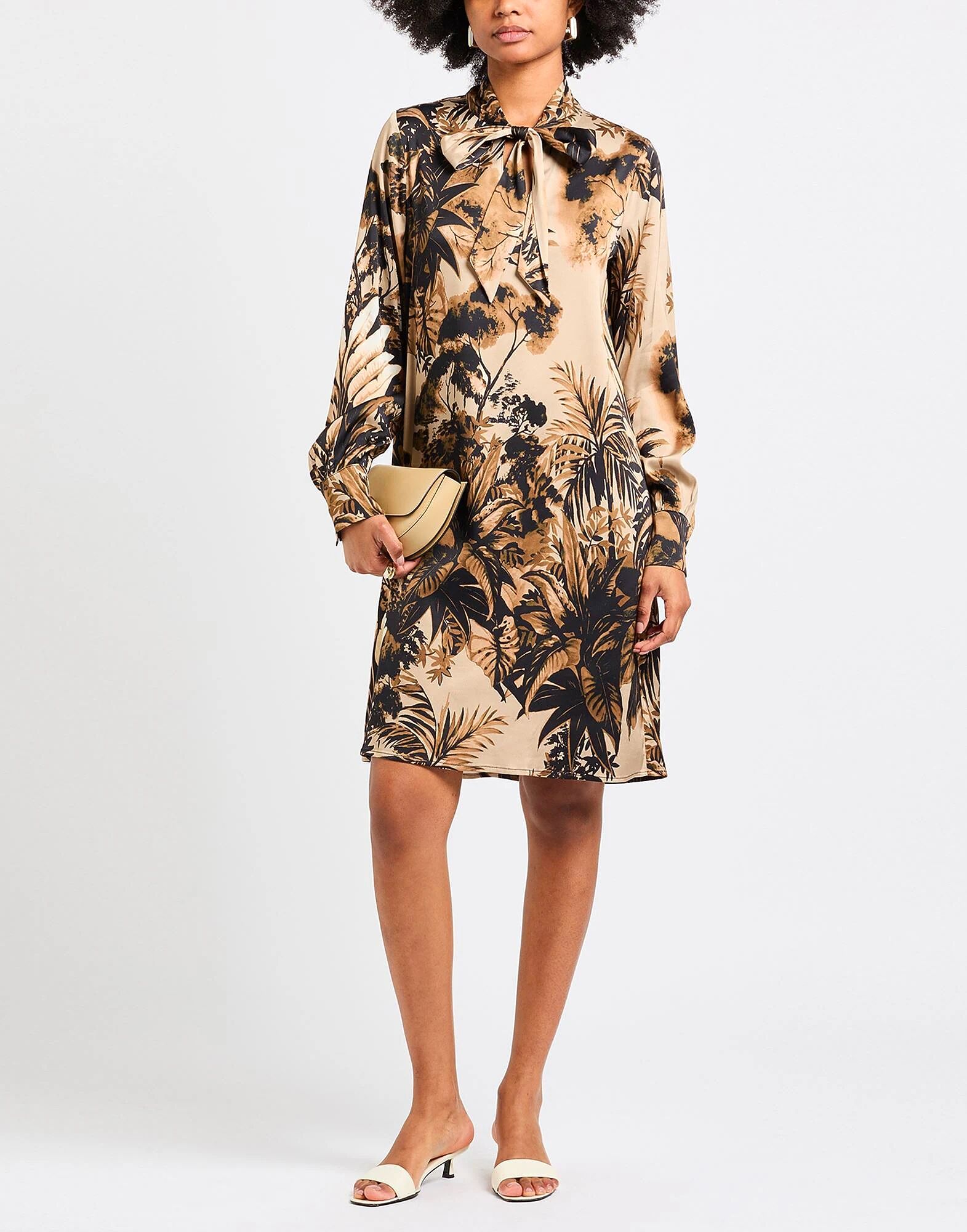Платье-клеш, атлас, цветочный принт, без аппликаций, воротник-бабочка, длинные рукава, манжеты на пуговицах, без подкладки, эластичное, химчистка, не отбеливать, не сушить в сушильной машине