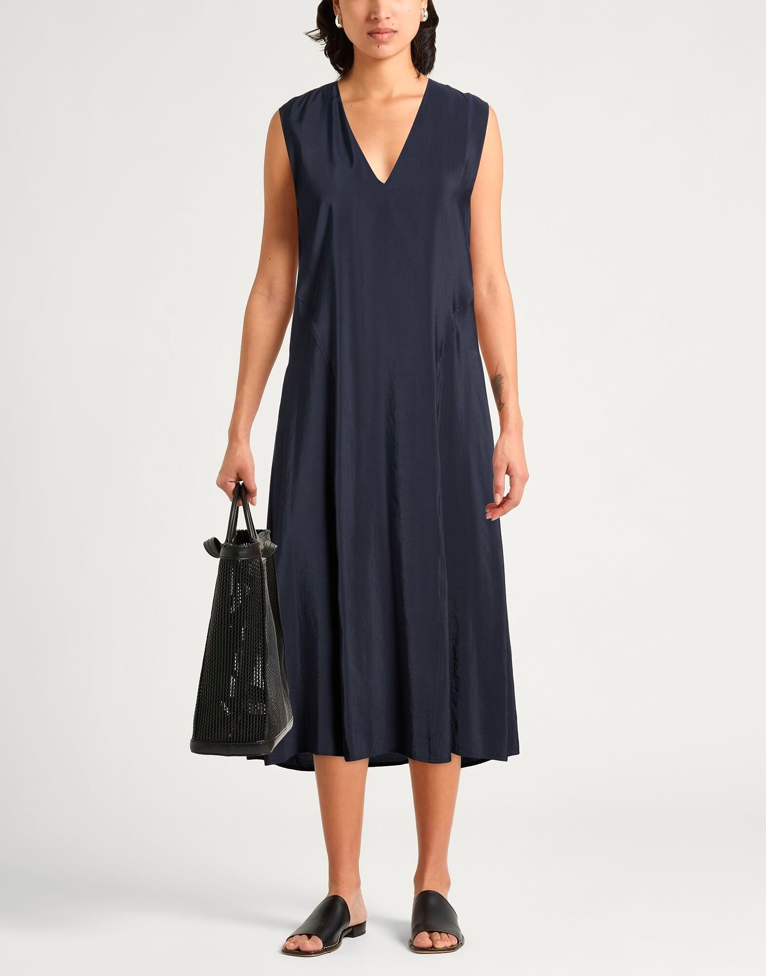 Платье-клеш, тканое, однотонное, без аппликаций, V-образный вырез, без рукавов, без подкладки, застежка-молния, прорезные карманы, химчистка, не отбеливать, не сушить в сушильной машине Деловой стиль сочетается с элегантностью в этом шикарном офисном наряде, который будет вселять уверенность каждый день