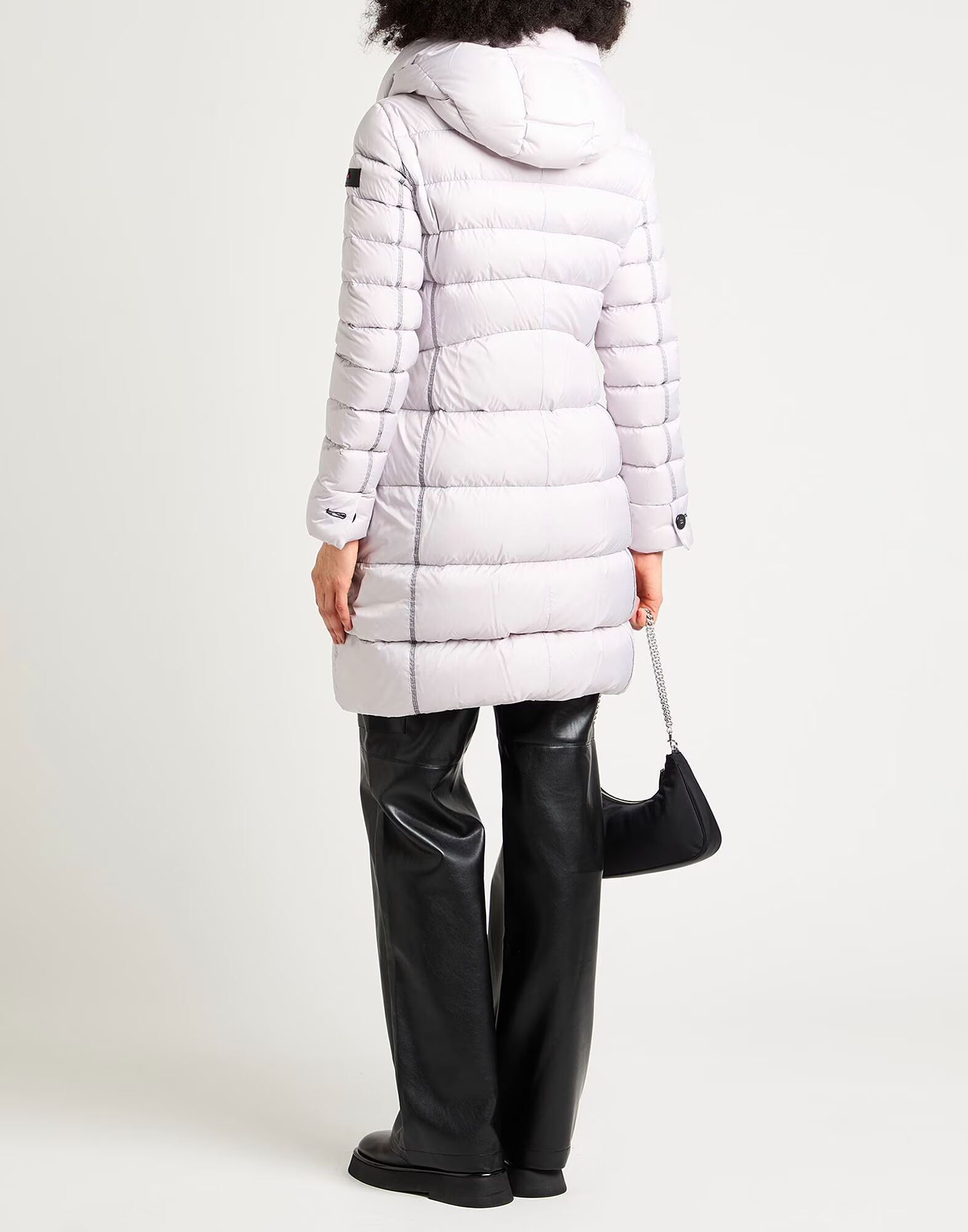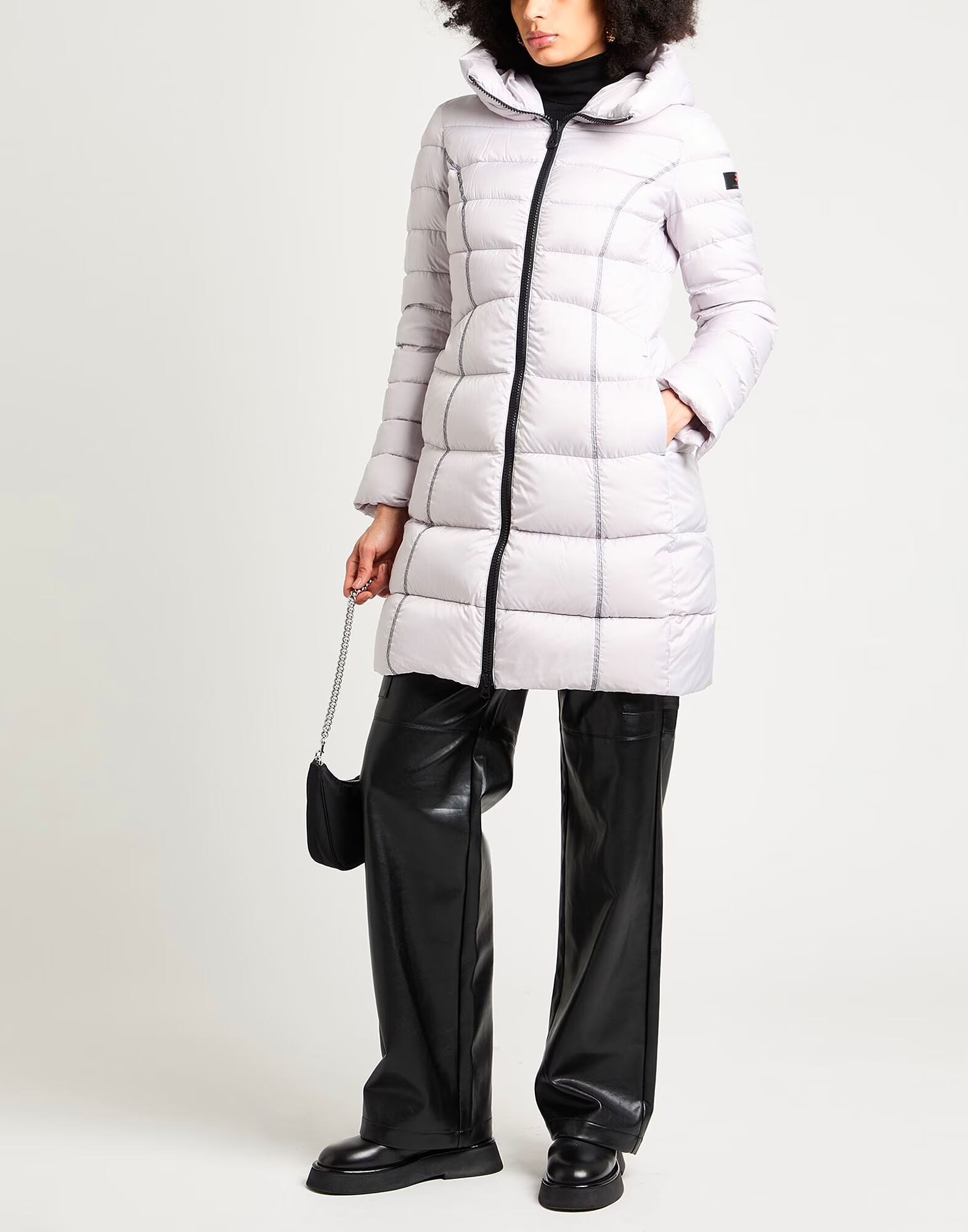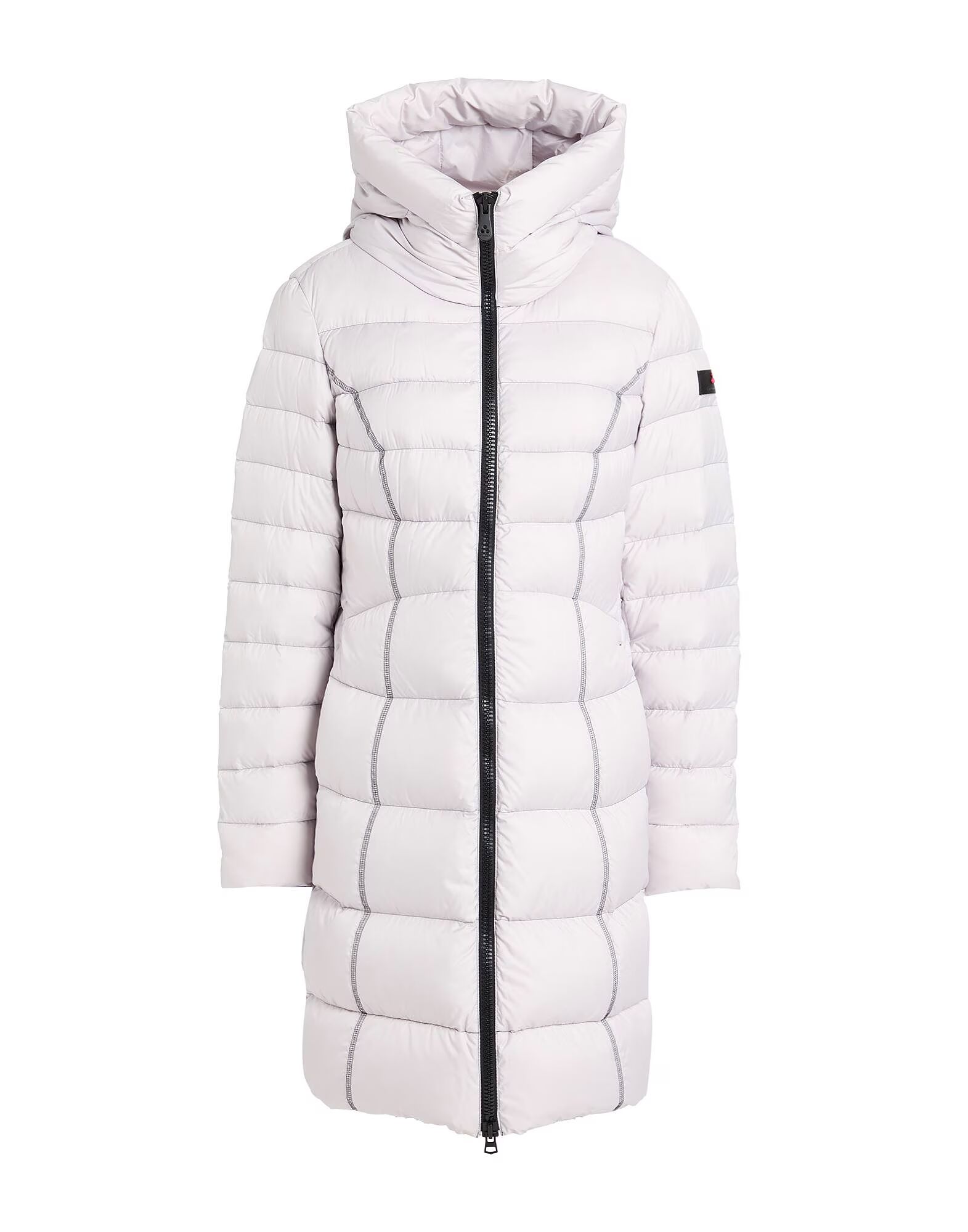 Пуховое пальто, верхняя ткань, стеганое, водоотталкивающее, с логотипом бренда, однотонное, с капюшоном, длинные рукава, наполнитель из утиного пуха, плотный утеплитель, застежка-молния, прорезные карманы, внутренние карманы, содержит нетекстильные части животного происхождения, машинная стирка, не отбеливать, сушка в сушильной машине