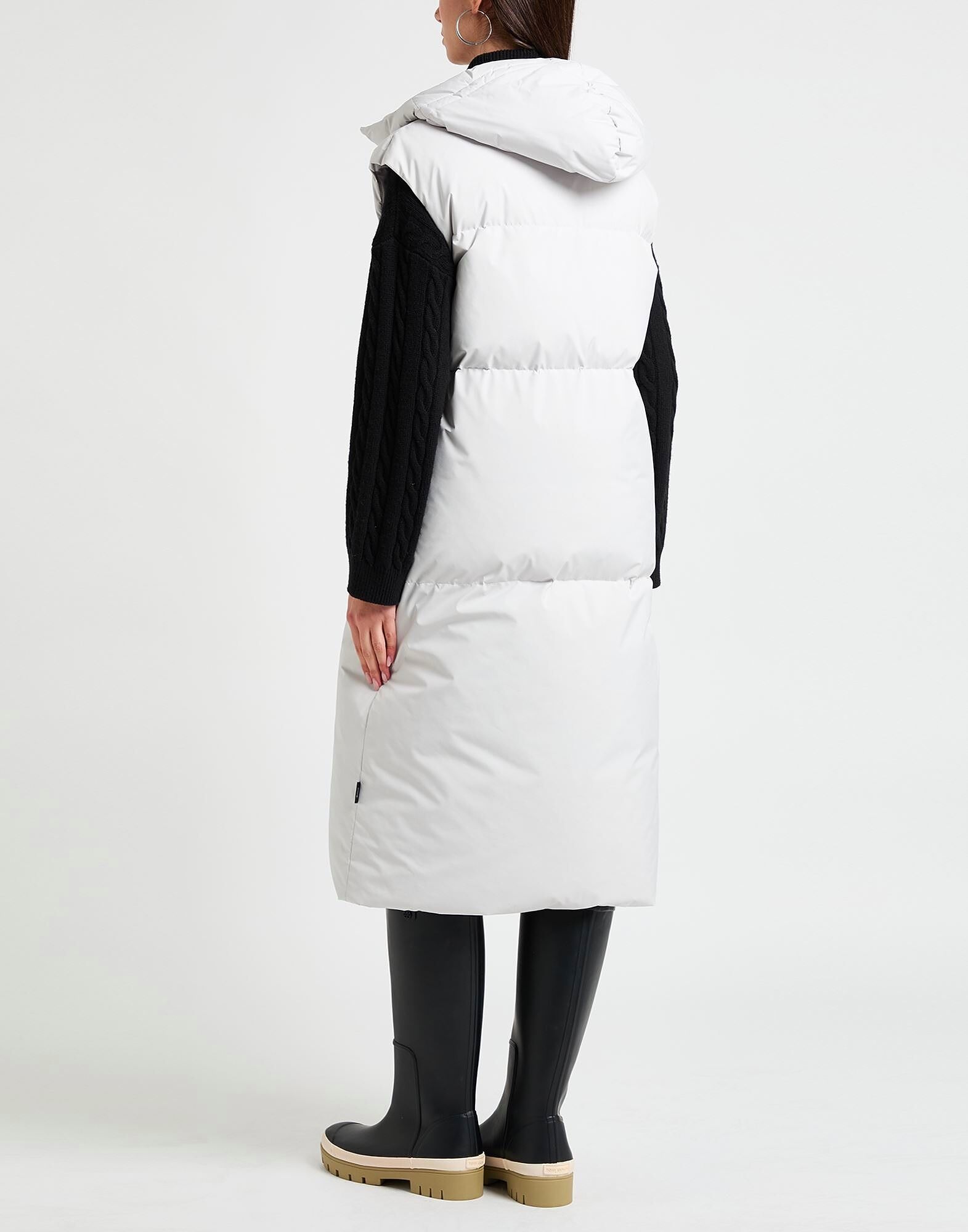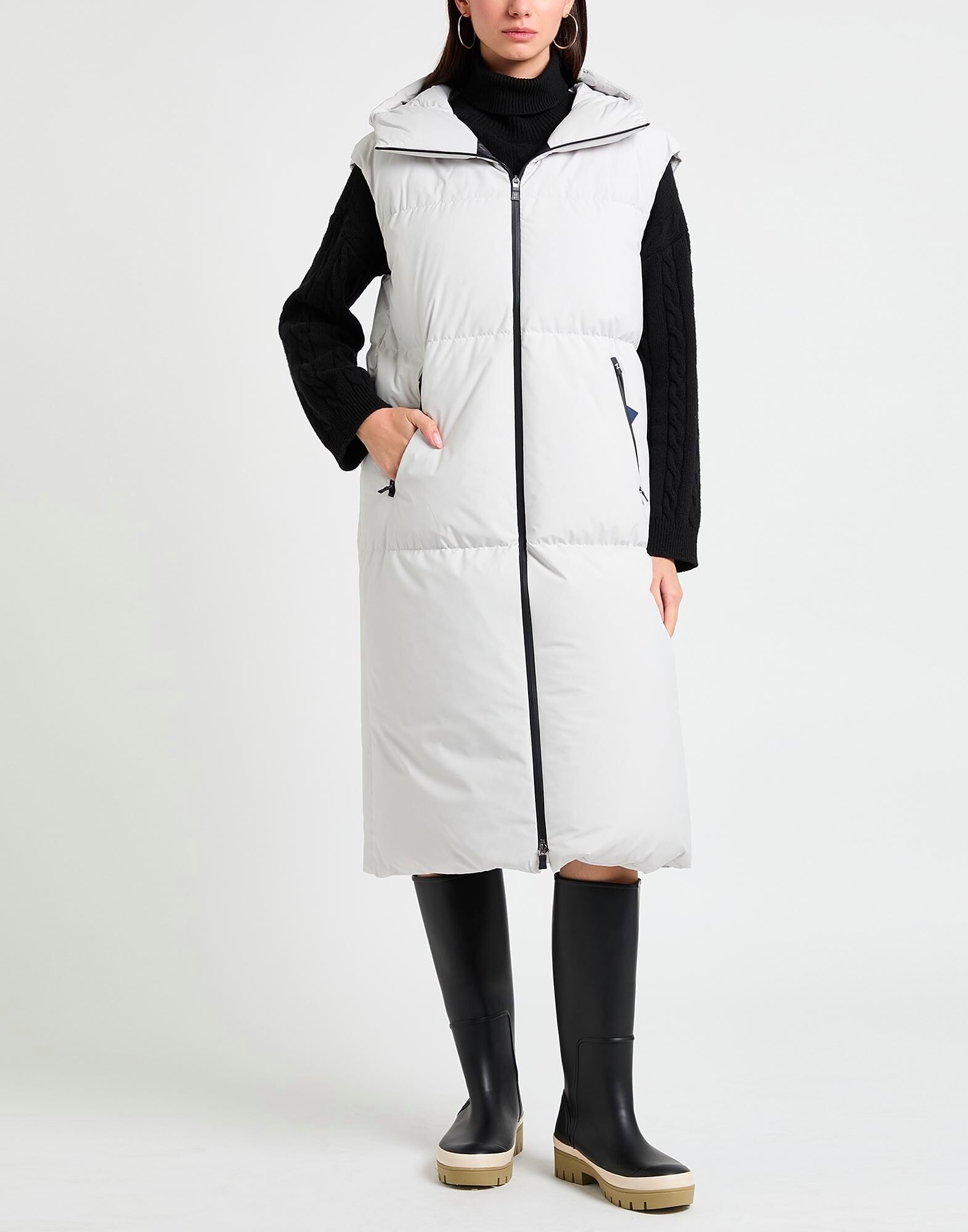 Пуховое пальто, верхняя ткань, стеганое, с логотипом бренда, однотонное, с капюшоном, без рукавов, подкладка из гусиного пуха, плотный утеплитель, застежка-молния, карманы на молнии, содержит нетекстильные части животного происхождения, ручная стирка, не отбеливать, не сушить в сушильной машине, не гладить