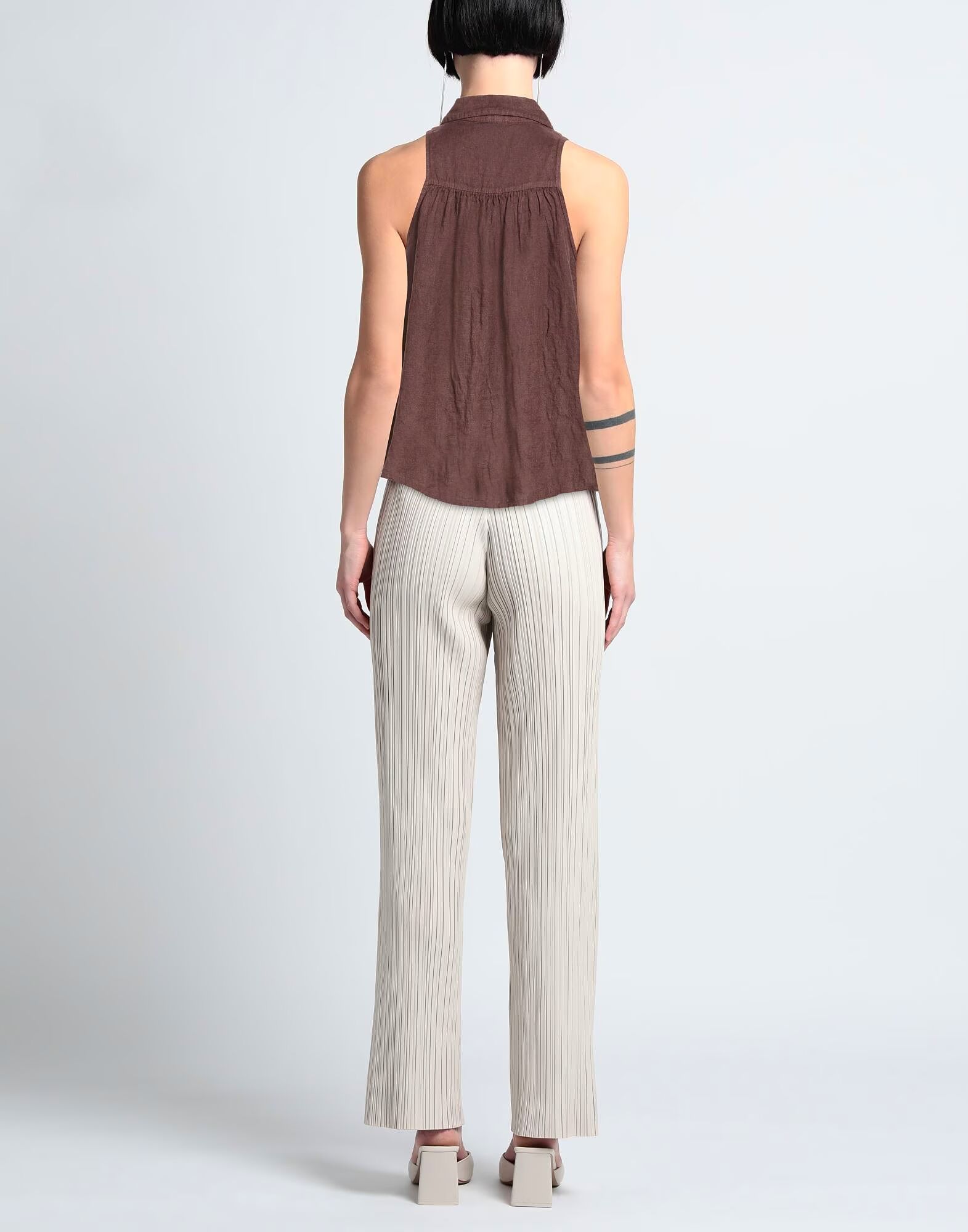 Рубашка, лен, однотонная, со сборками, классический воротник, без рукавов, застежка на пуговицы, машинная стирка или химчистка, не отбеливать, не сушить в сушильной машине Планируете поездку на выходные или отдых на пляже? Это идеальный летний стиль для вас