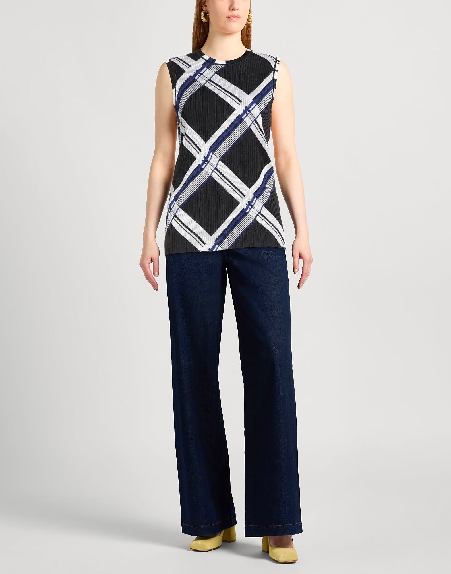 Трикотаж интарсия, ребристый, легкий, фирменный принт, без аппликаций, круглый вырез, без рукавов, химчистка, не отбеливать, не сушить в сушильной машине