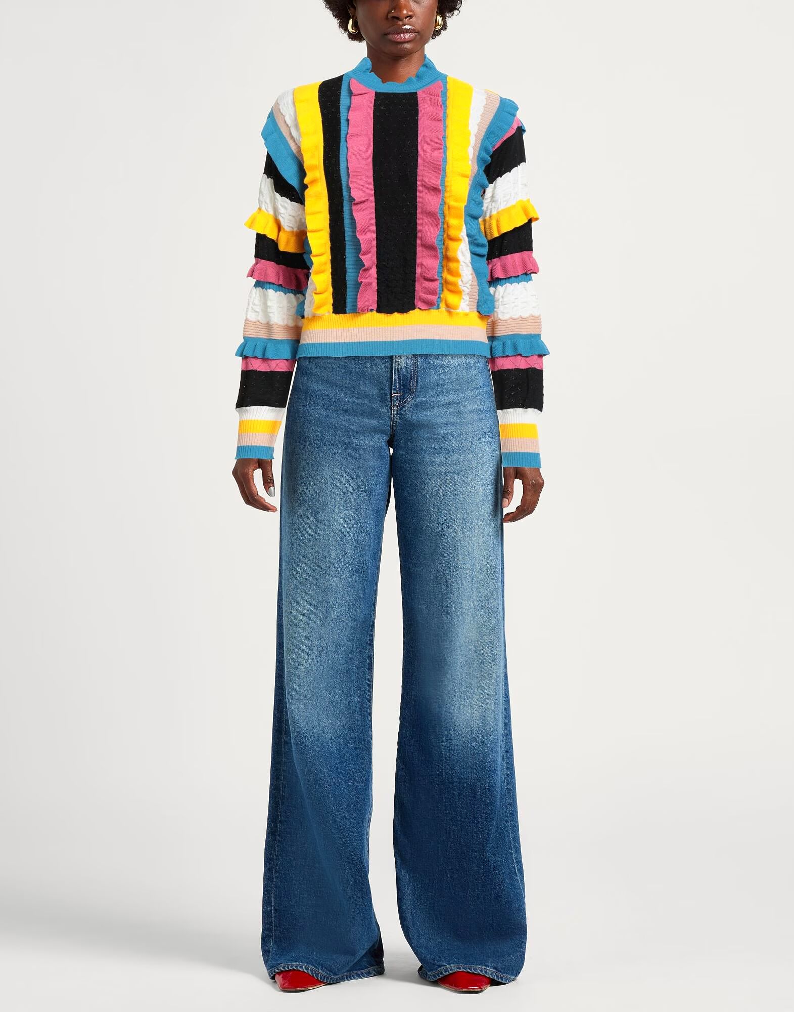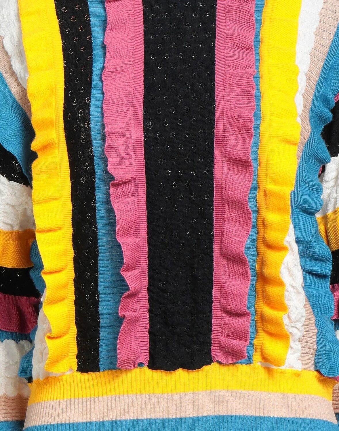 Вязание в технике интарсии, легкий трикотаж, многоцветный, с оборками, круглый вырез, длинные рукава, химчистка, не отбеливать, не сушить в сушильной машине