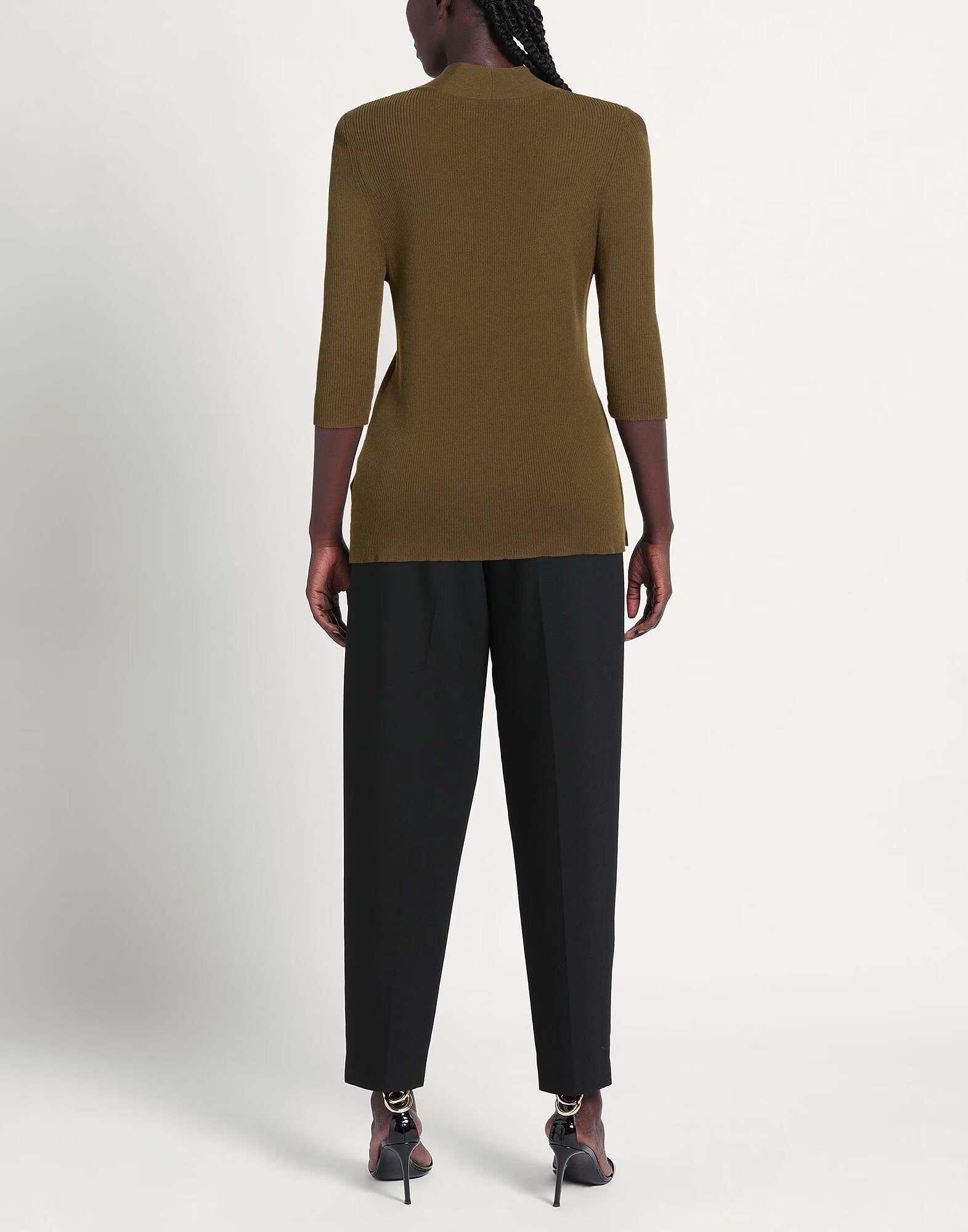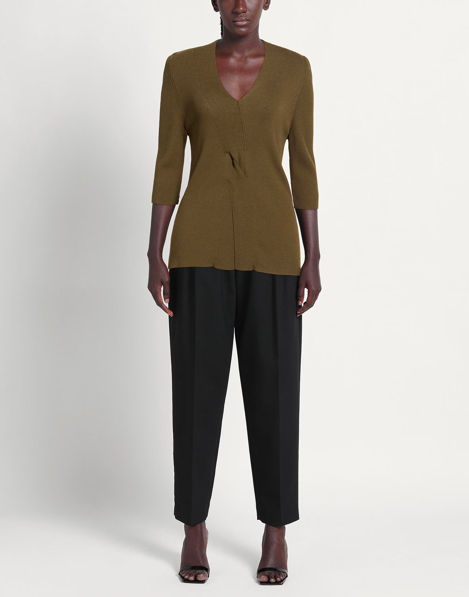 Трикотаж в рубчик, легкий, присборенный, однотонный, V-образный вырез, рукава 3/4, разрез спереди, машинная стирка или химчистка, не отбеливать, не сушить в сушильной машине