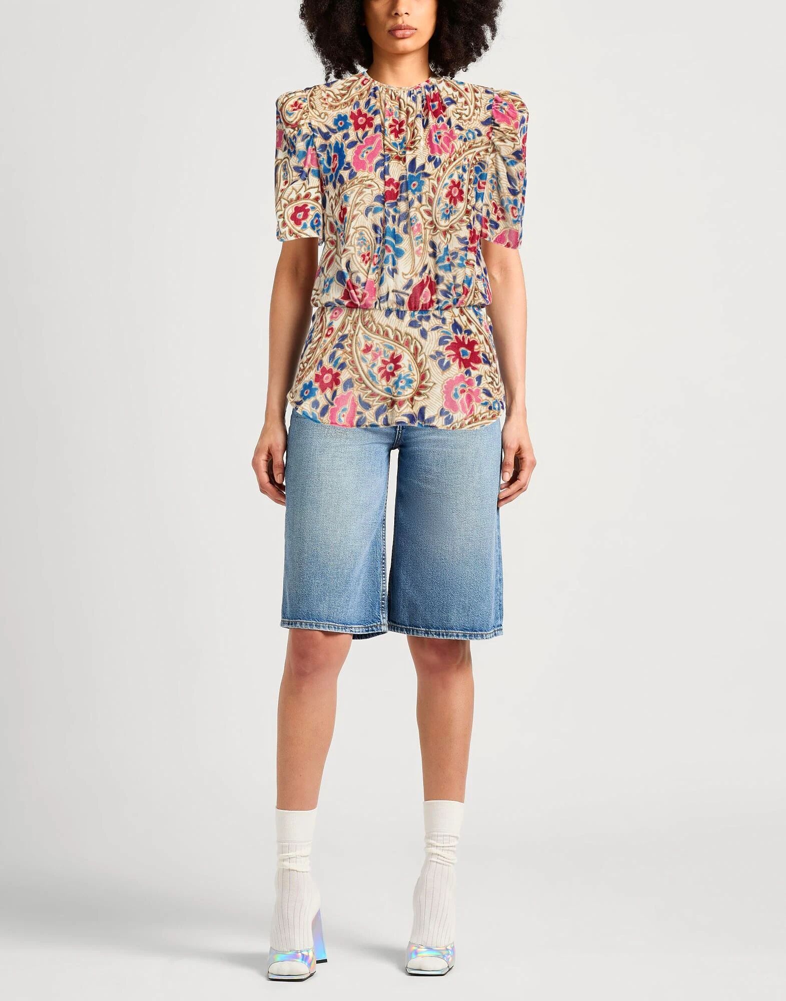 Топ с баской, бархат, узор «пейсли», без аппликаций, круглый вырез, короткие рукава, застежка на молнию, химчистка, не отбеливать, не сушить в сушильной машине