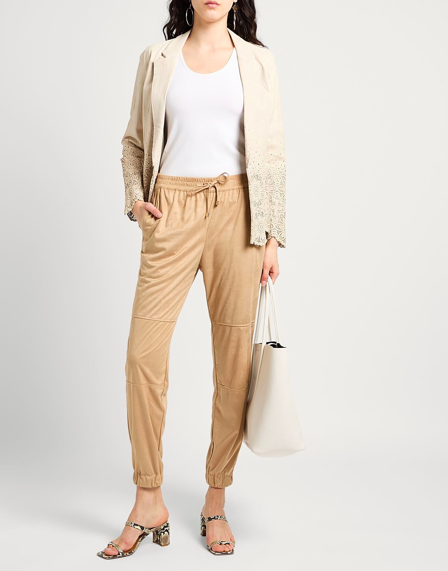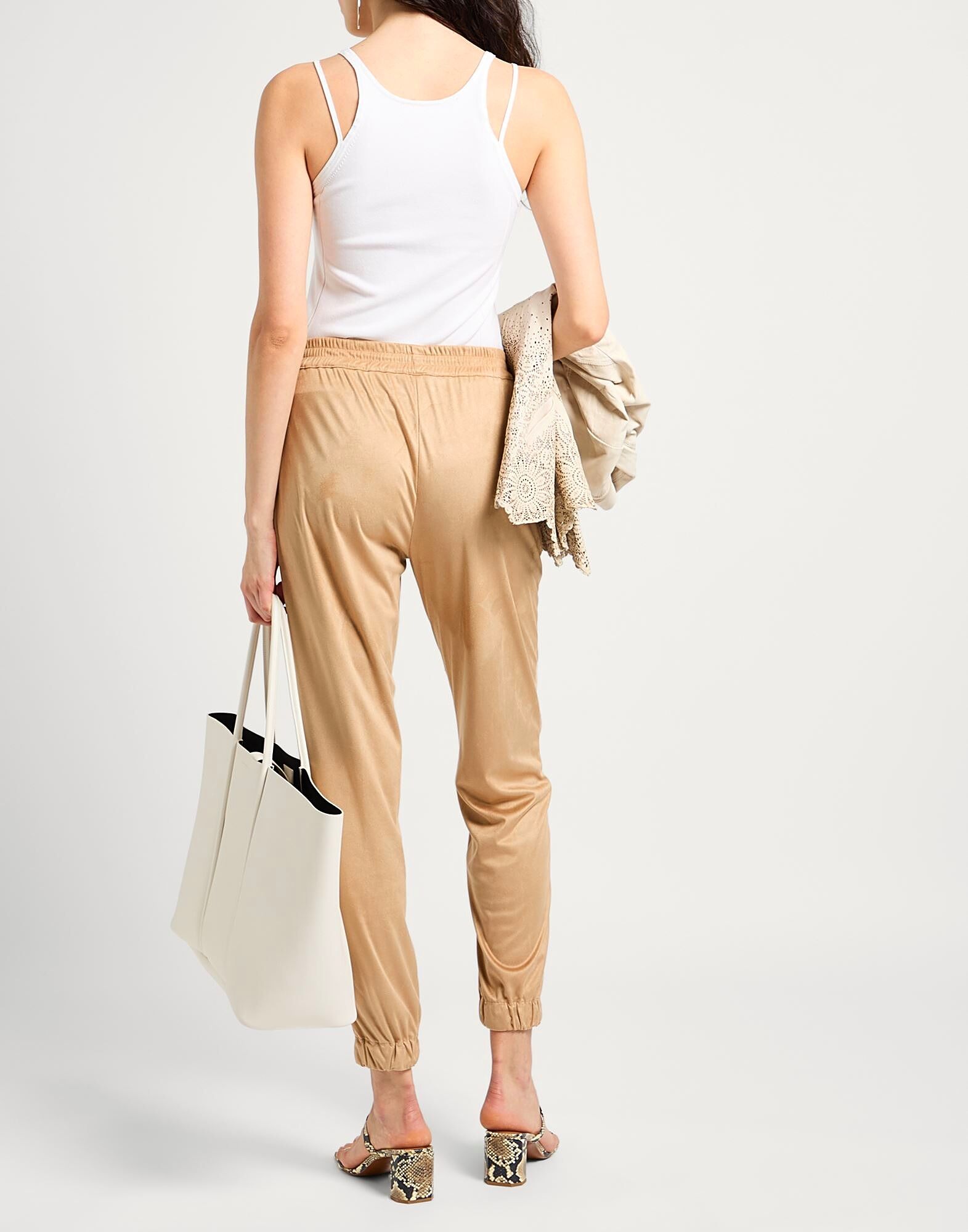 Зауженные брюки, ткань с эффектом замши, однотонные, без аппликаций, высокая талия, свободный крой, застежка на шнурке, множество карманов, ручная стирка или химчистка, не отбеливать, не сушить в сушильной машине