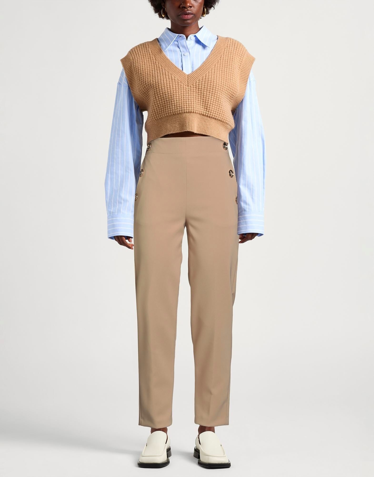 Зауженные брюки, креп, эластичная ткань, однотонные с аппликациями, украшены пуговицами, логотип бренда, высокая талия, эластичный пояс, стандартный крой, застежка на молнию, прорезные карманы, карманы на молнии, машинная стирка или химчистка, не отбеливать, не сушить в сушильной машине