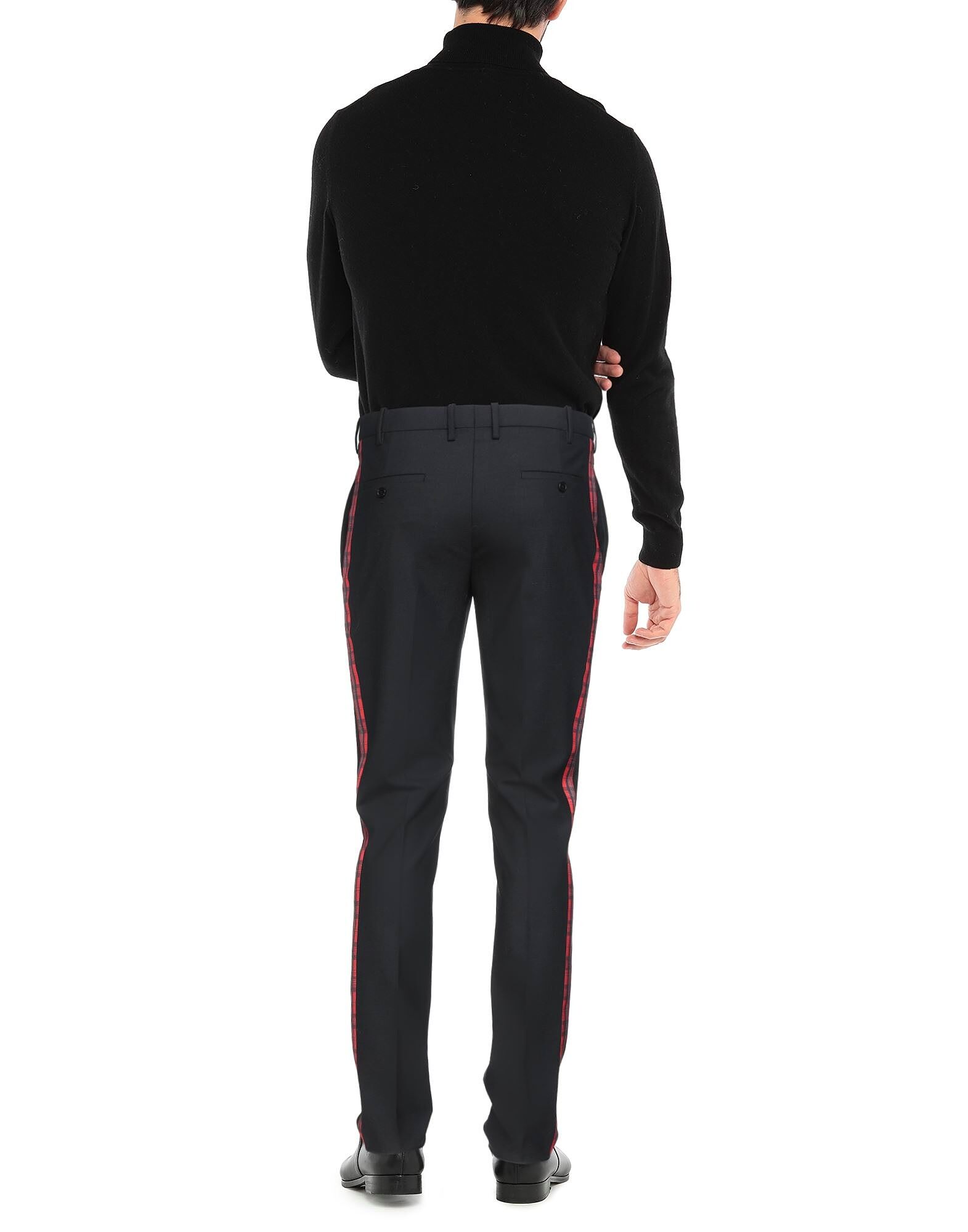 Прохладная шерсть, однотонный цвет с аппликациями, полосы по боковым швам, средняя посадка, стандартный крой, зауженные штанины, пуговица, молния, множество карманов, эластичные