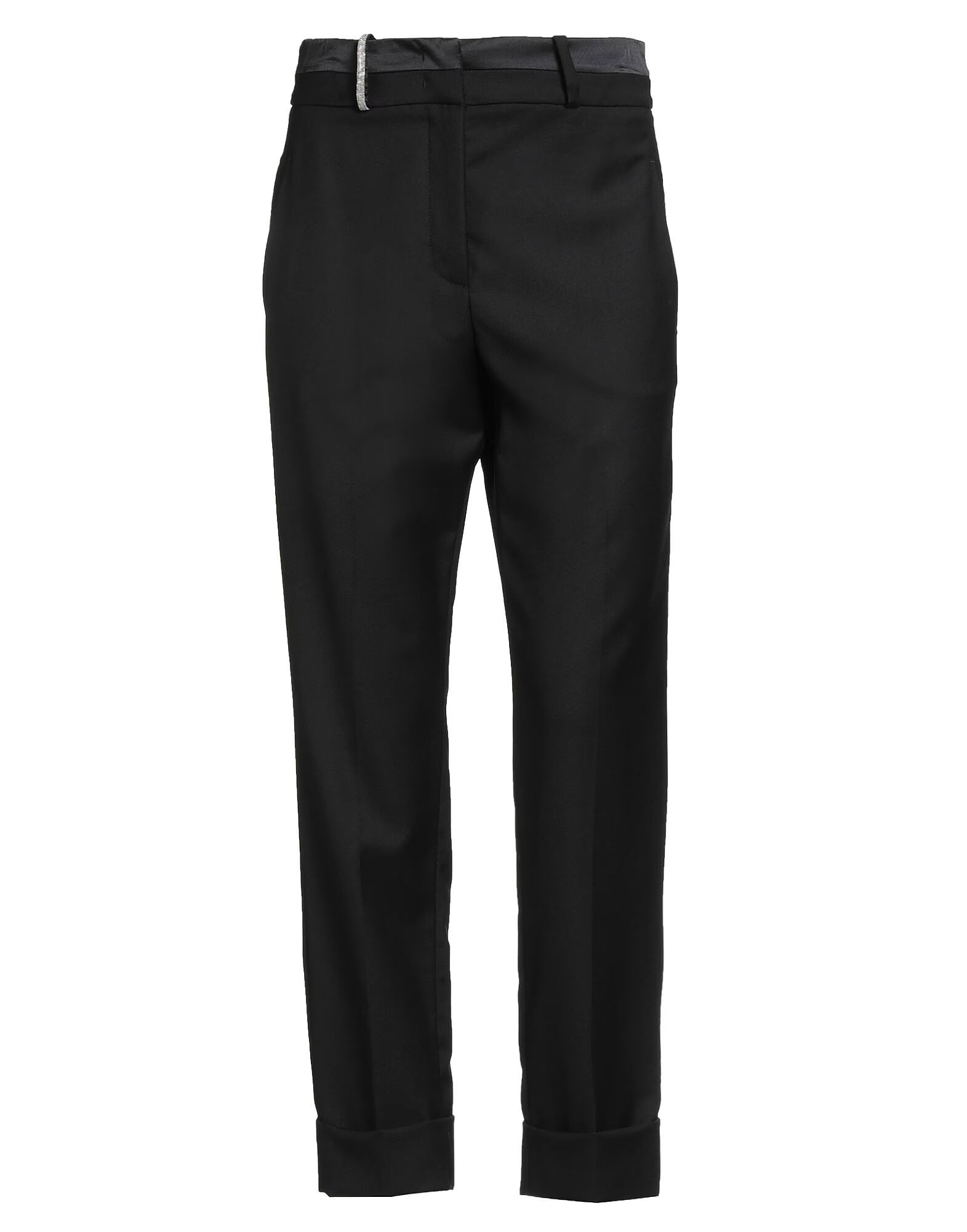 Прохладная шерсть, атлас, бисер, однотонный цвет с аппликациями, высокая талия, шлевки для ремня, стандартный крой, застежка на молнию, застежки на крючки, подвернутый низ, множество карманов, химчистка, не отбеливать, не сушить в сушильной машине, зауженные брюки