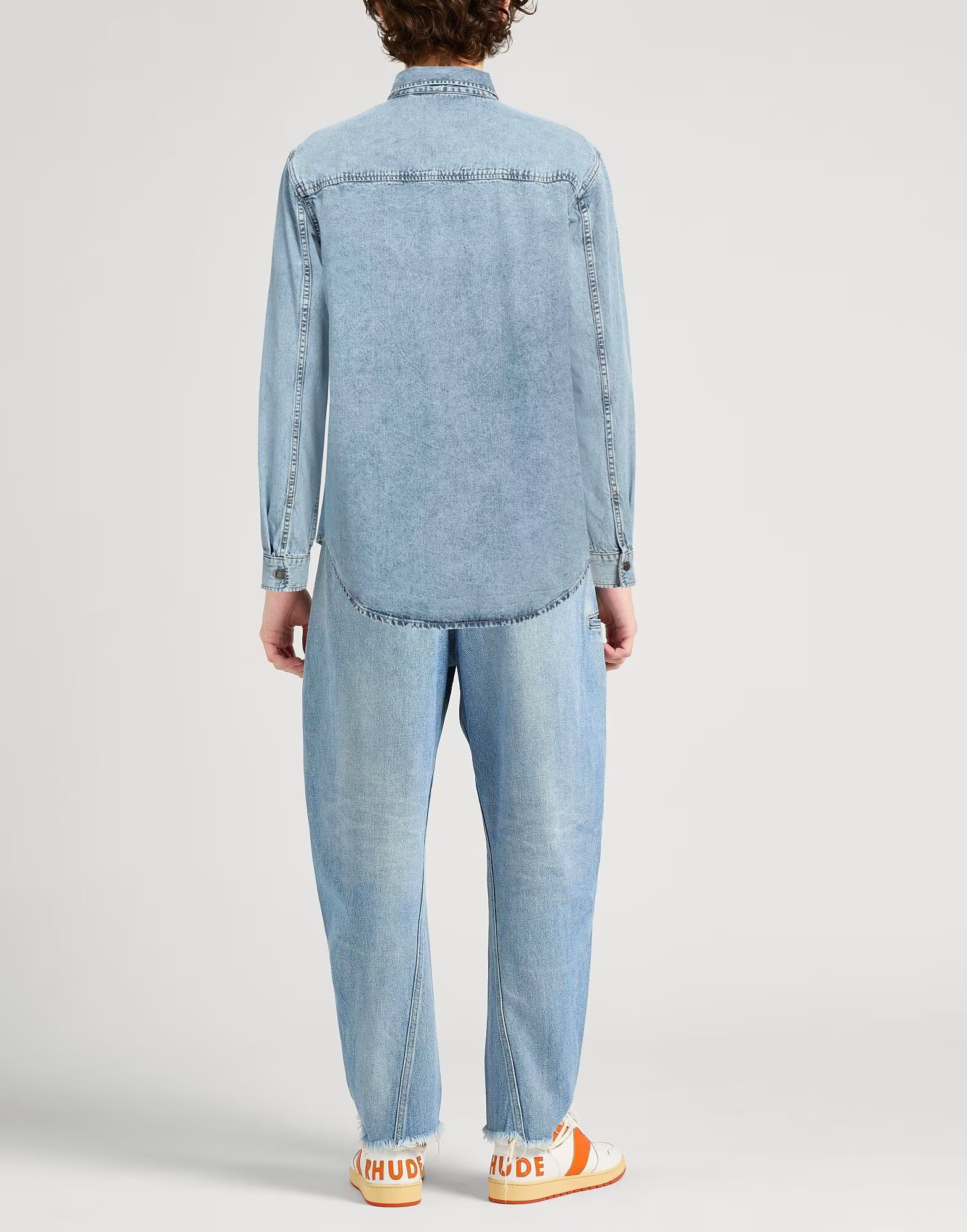 Джинсовая ткань, однотонная, вышитый логотип, светлый оттенок, классический воротник, длинные рукава, манжеты на пуговицах, застежка на пуговицы, два нагрудных кармана, машинная стирка или химчистка, не отбеливать, не сушить в сушильной машине