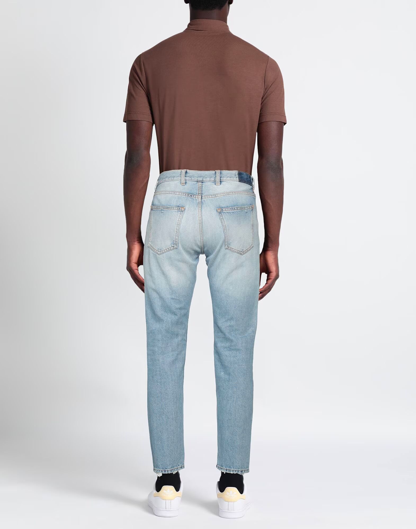 Джинсовая ткань, выцветшая, логотип бренда, однотонная, средняя степень потертости, низкая посадка, шлевки для ремня, зауженные штанины, стандартный крой, застежка на пуговицы, пять карманов, модель узкая