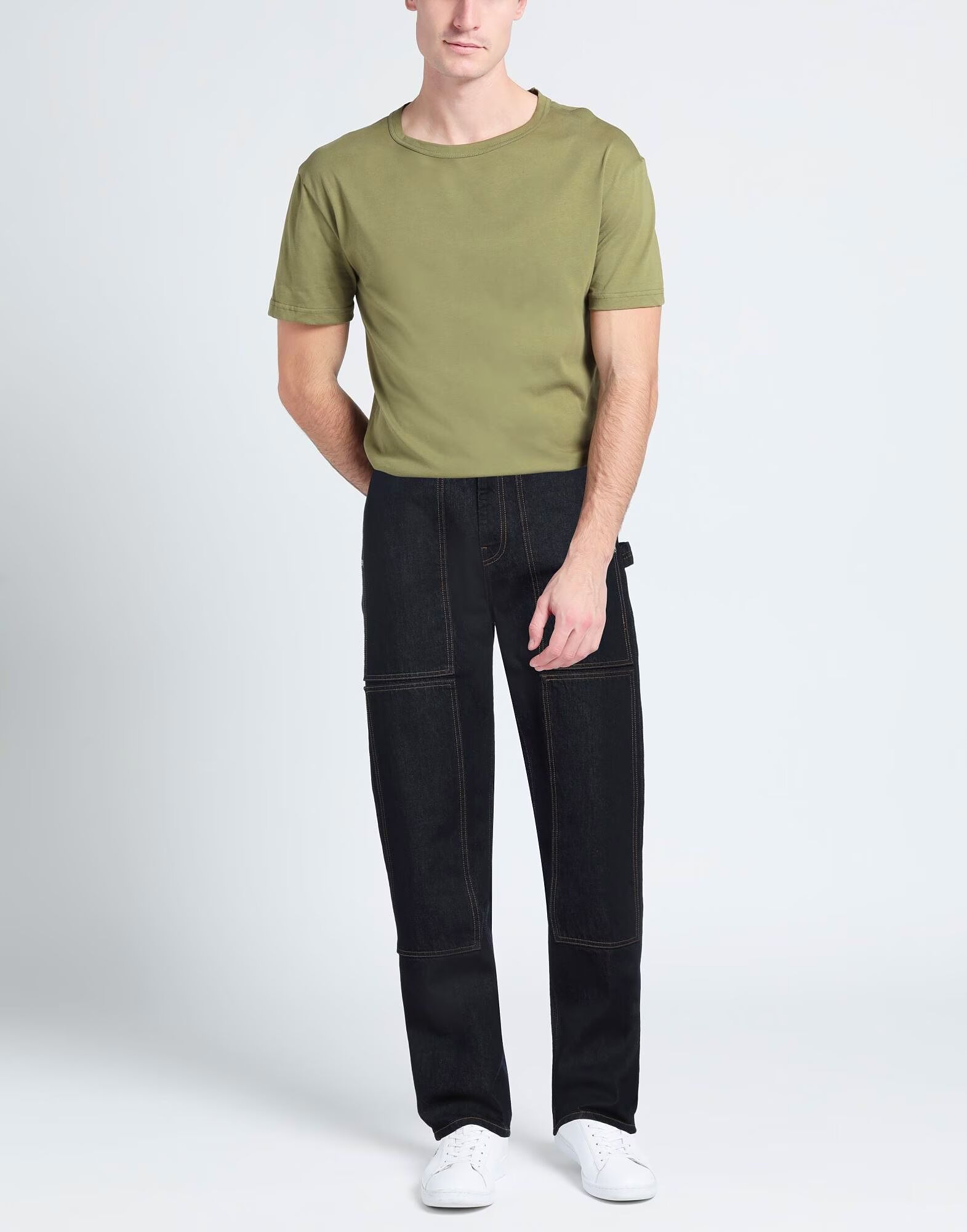 Джинсовая ткань, логотип бренда, однотонный цвет, темный оттенок, высокая талия, застежка на молнию, застежка на пуговицы, несколько карманов, машинная стирка, не отбеливать, не сушить в сушильной машине, джинсы прямого кроя