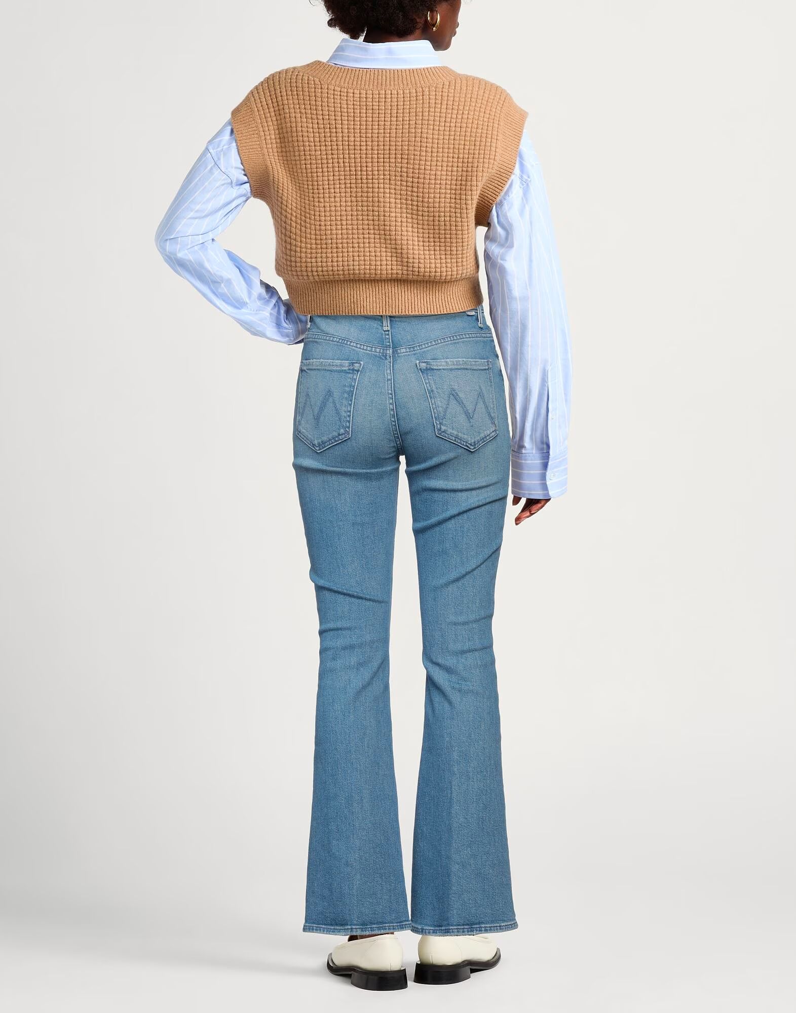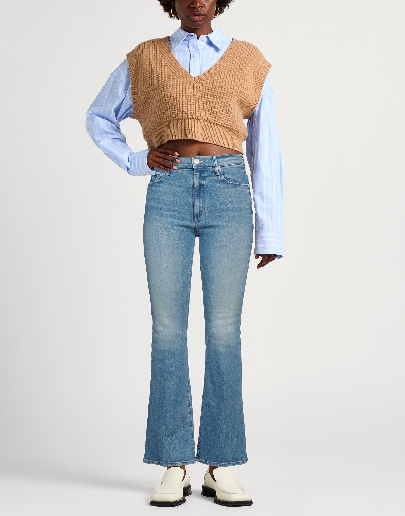 Расклешенные джинсы, модель: джинсы-дождевики с высокой талией, однотонные, без аппликаций, светлый оттенок, высокая талия, стандартный крой, застежка на пуговицы, застежка на молнию, несколько карманов, машинная стирка или химчистка, не отбеливать, сушить в сушилке