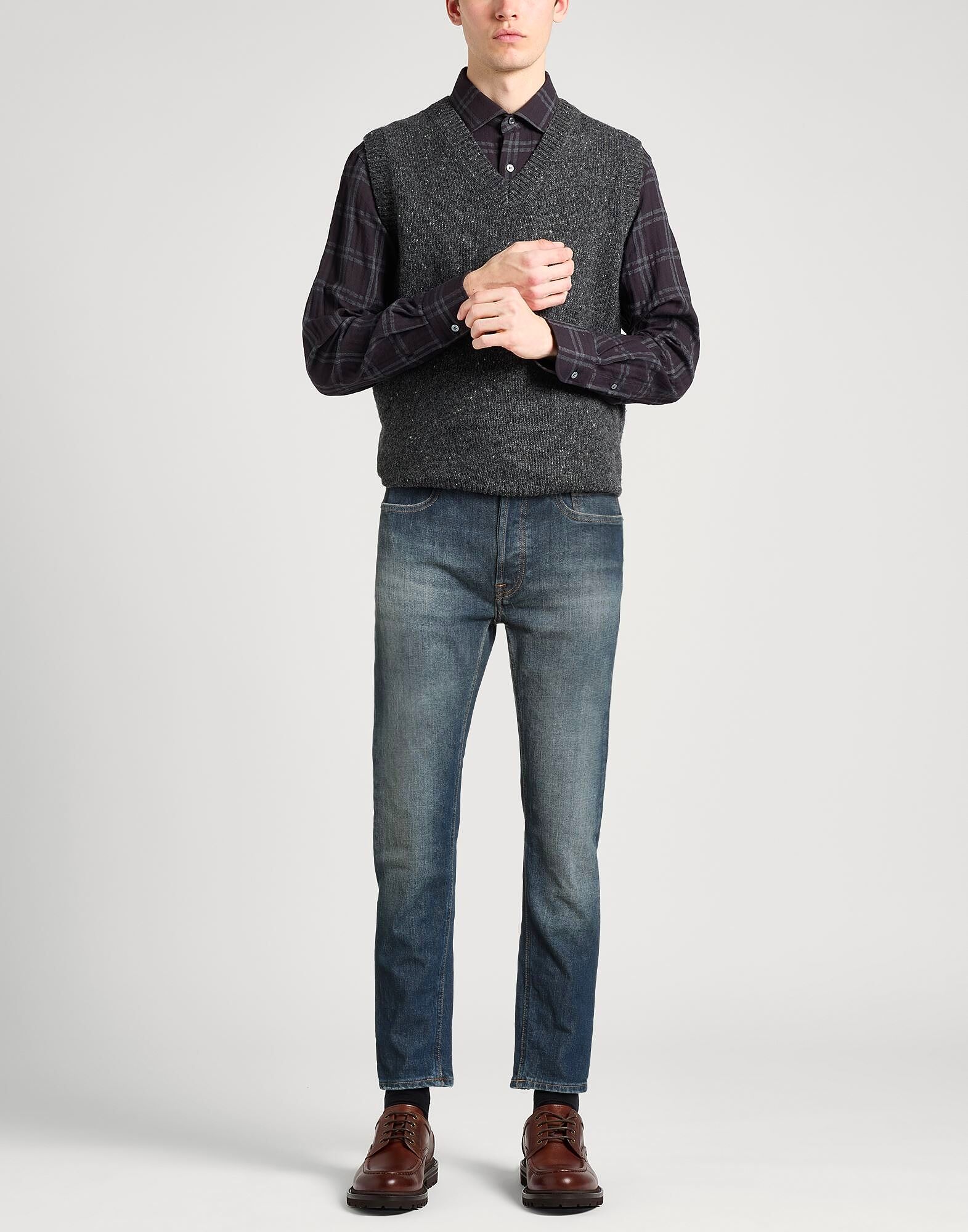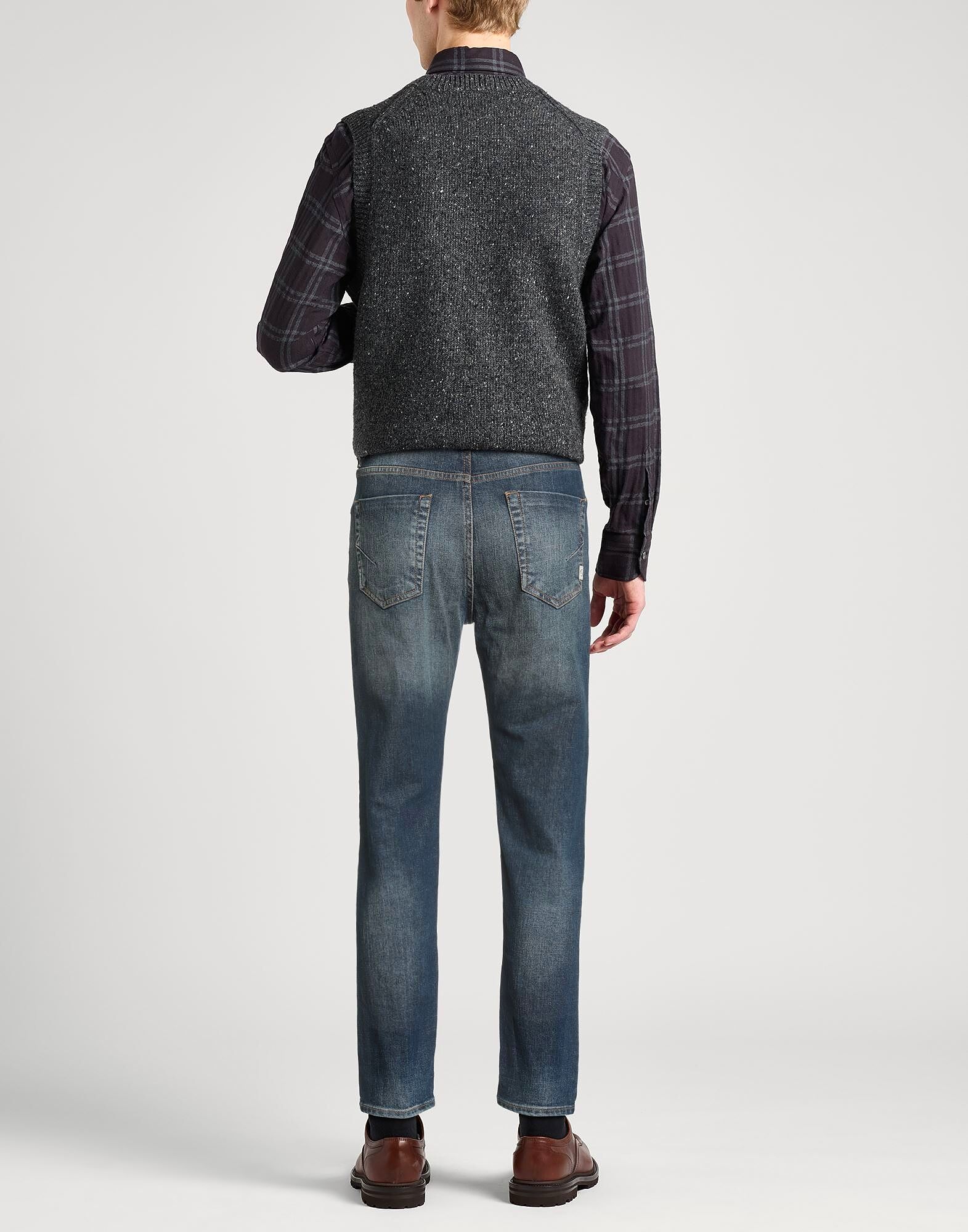 Узкие джинсы, деним, выцветшие, однотонные, с логотипом бренда, темный цвет, средняя посадка, петли для ремня, зауженный крой, потайная застежка на пуговицы, пять карманов, машинная стирка, не отбеливать, сушка в сушильной машине