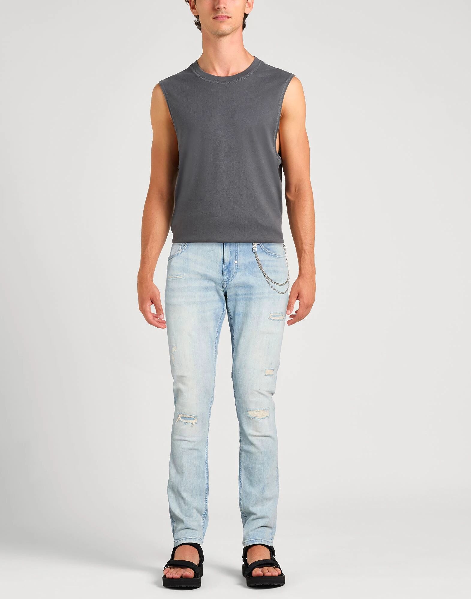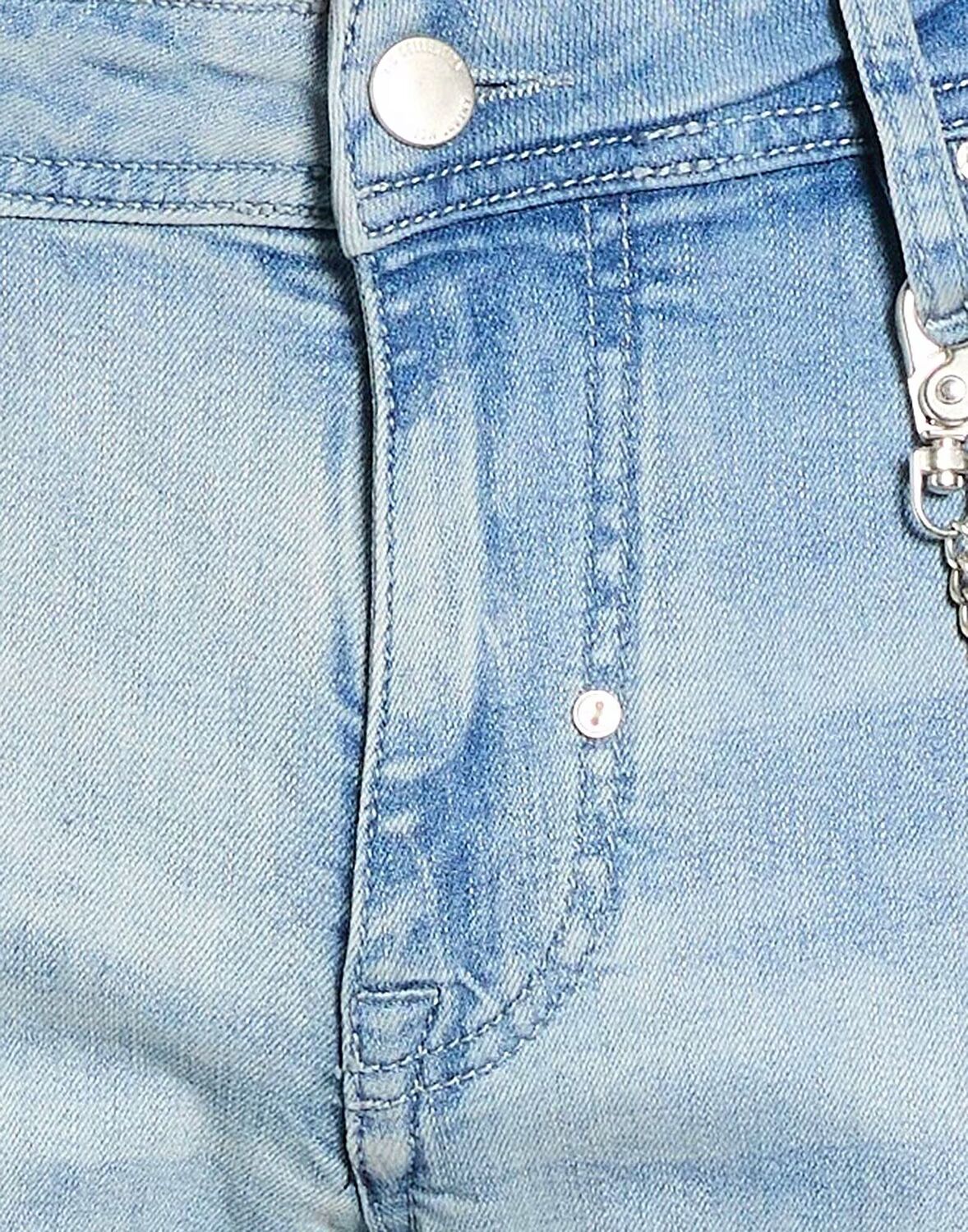Зауженные джинсы, деним, рваные, выцветшие, однотонные, с логотипом бренда, средней степени потертости, средняя посадка, петли для ремня, облегающий крой, застежка на пуговицы, застежка на молнию, пять карманов, машинная стирка, не отбеливать, не сушить в сушильной машине