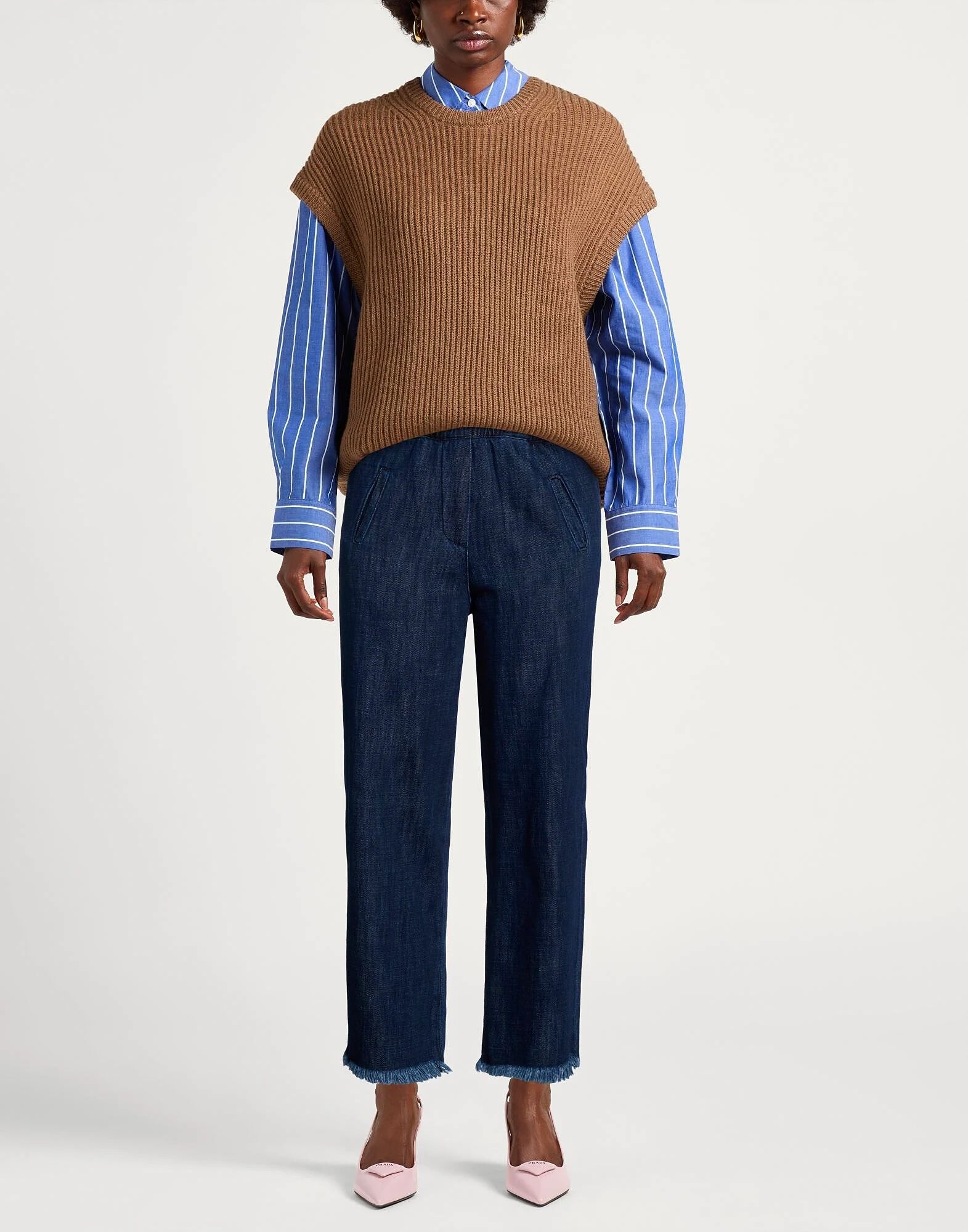 Джинсы прямого кроя, деним, однотонные, без аппликаций, темный цвет, высокая талия, эластичный пояс, стандартный крой, бахрома по низу, прорезные карманы, накладные карманы, машинная стирка, не отбеливать, сушить в сушилке
