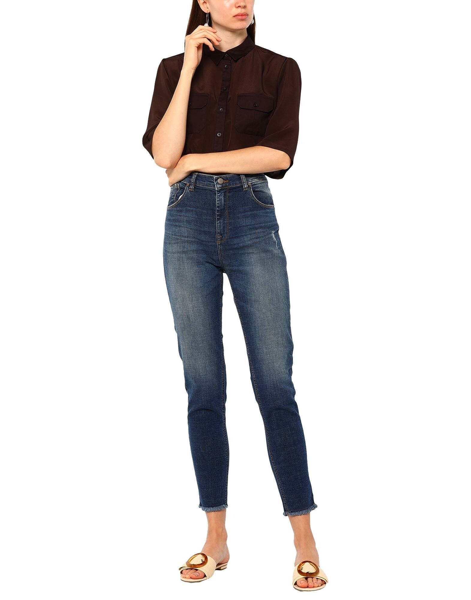 Джинсовая ткань, выцветшая, с логотипом, эффект потертости, однотонная, средней степени выцветания, высокая талия, застежка спереди, пуговица, молния, бахрома по низу, множество карманов, эластичная ткань
