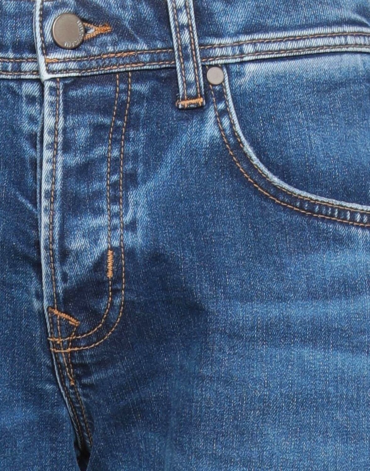 Зауженные джинсы, деним, выцветшие, однотонные, логотип бренда, кожаная отделка, темный цвет, средняя посадка, стандартный крой, застежка на пуговицы, пять карманов, машинная стирка или химчистка, не отбеливать, сушить в сушилке, содержит нетекстильные части животного происхождения