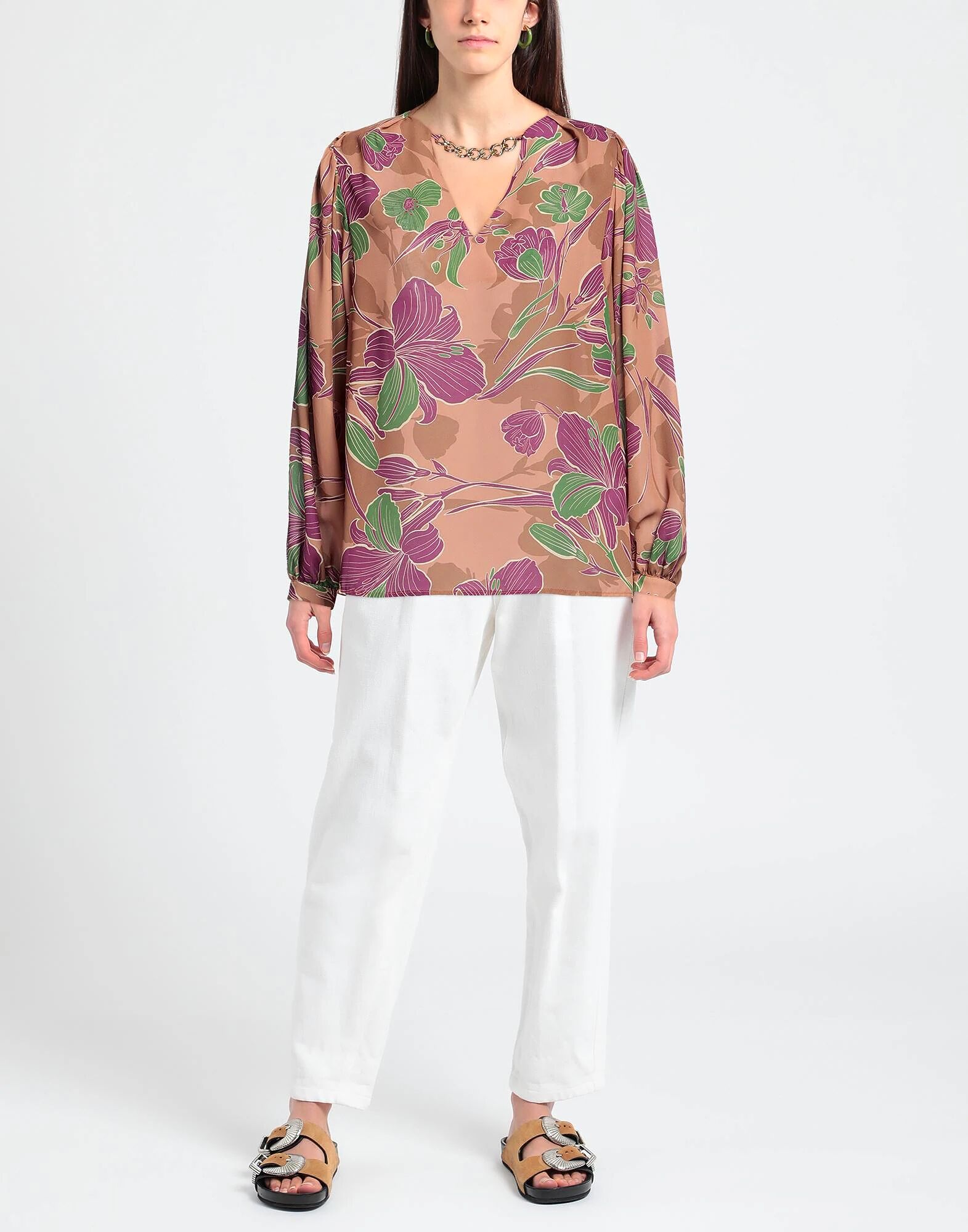 Топ, креп, цветочный принт, без аппликаций, круглый вырез, длинные рукава, манжеты на пуговицах, 1 пуговица