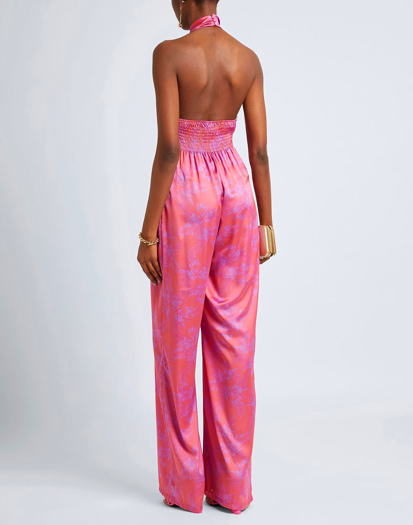 Атлас, логотип бренда, цветочный принт, воротник-халтер, без рукавов, без подкладки, эластичный пояс, множество карманов