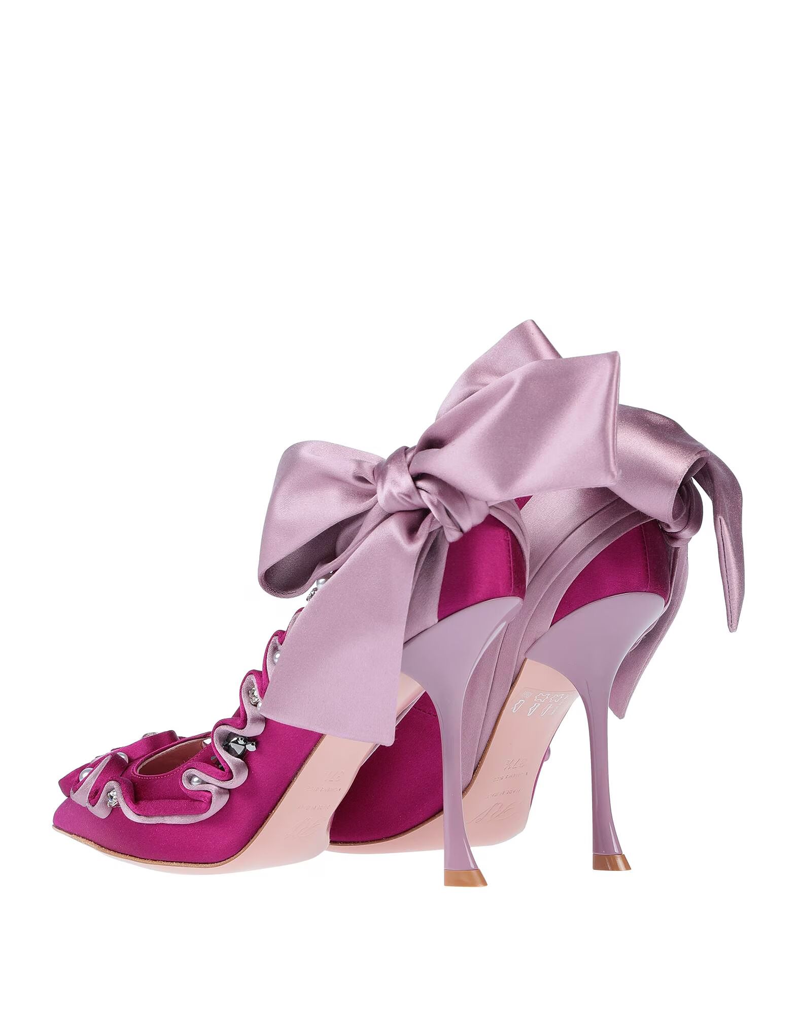 Туфли-лодочки, атлас, однотонные, с кристаллами, с бантом, кожаная подкладка, заостренный носок, геометрический каблук, кожаная подошва, содержат нетекстильные части животного происхождения
