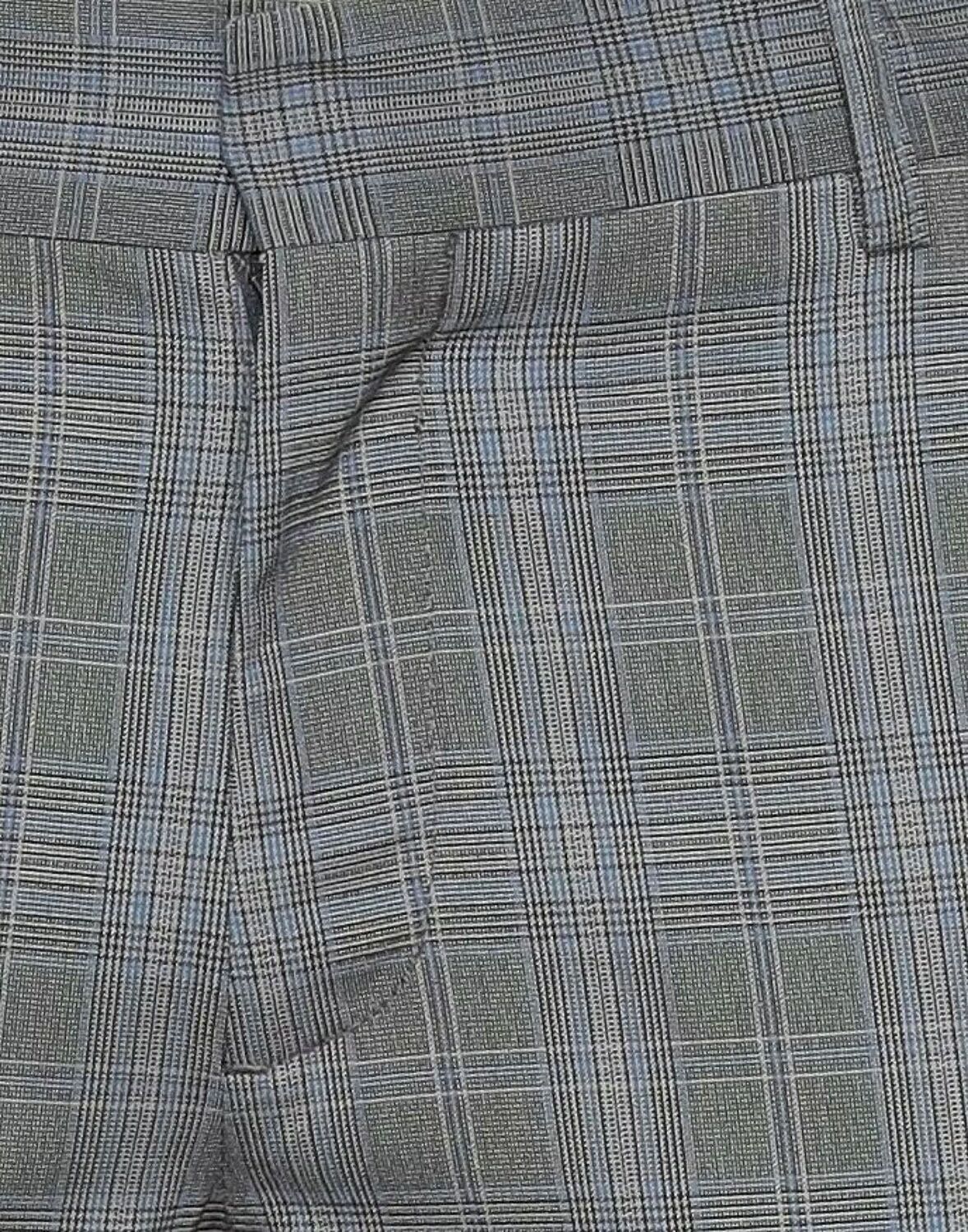 Ткань простого переплетения, без аппликаций, клетка «глен плейд», средняя посадка, зауженные штанины, стандартный крой, застежка на крючки и петли, застежка на молнию, множество карманов, эластичные