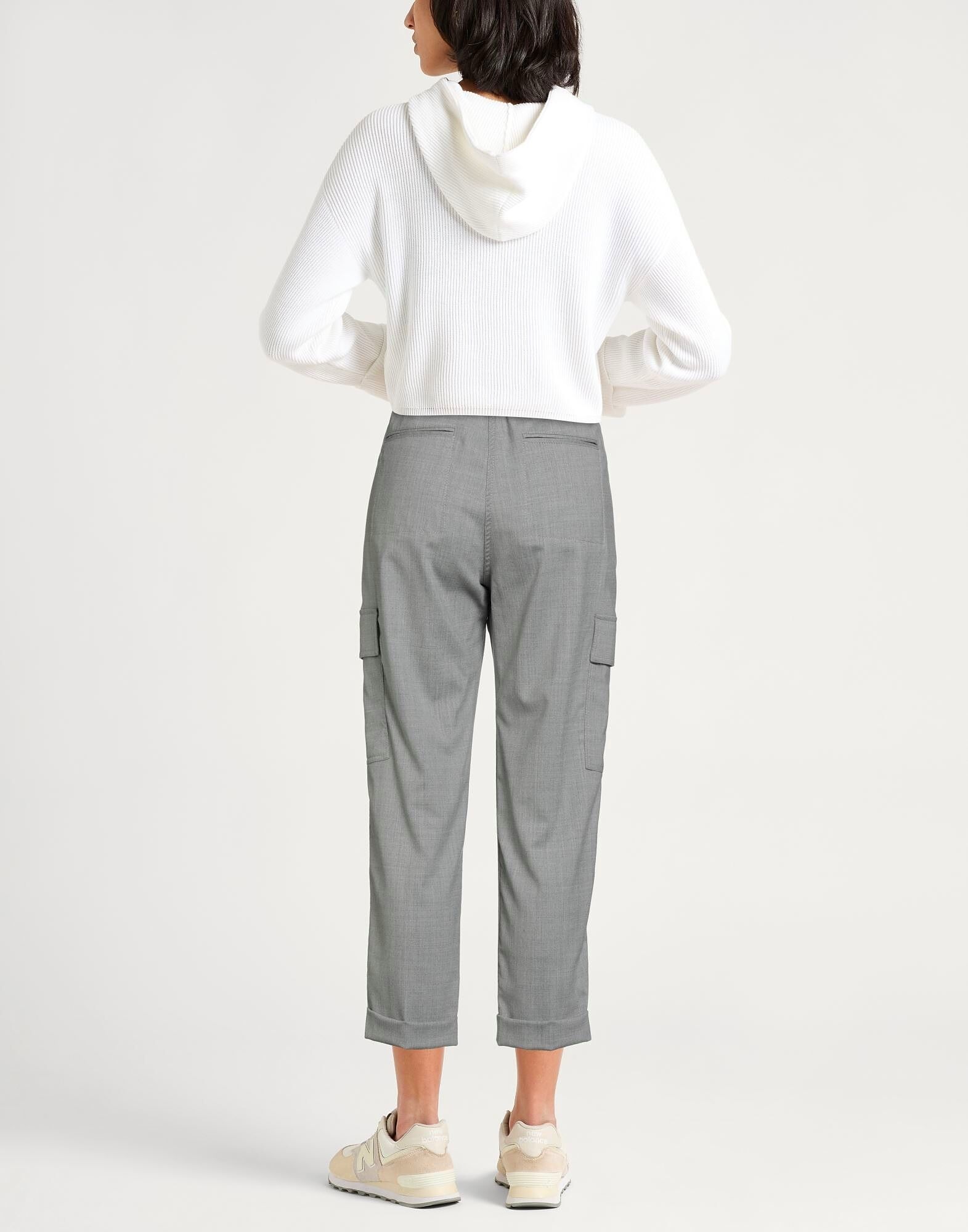 Брюки-карго, прохладная шерсть, эластичная ткань, однотонные, вытачки, кожаная отделка, высокая талия, шлевки для ремня, стандартный крой, застежка на молнию, застежки на крючки, подвернутый низ, множество карманов, химчистка, не отбеливать, не сушить в сушильной машине, содержит нетекстильные части животного происхождения