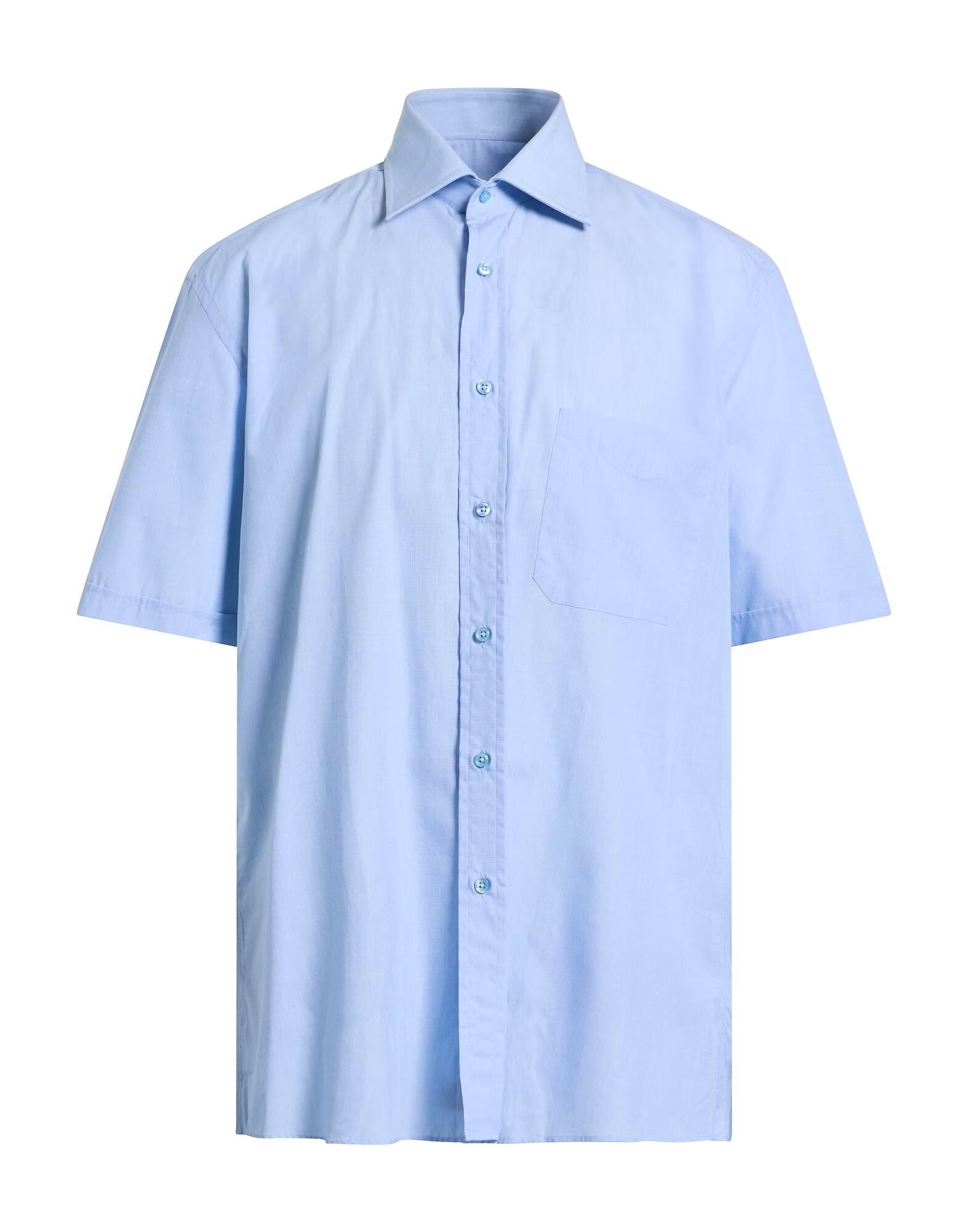 Рубашка стандартного кроя, тканая, однотонная, без аппликаций, классический воротник, короткие рукава, застежка на пуговицы, один нагрудный карман, машинная стирка или химчистка, не отбеливать, не сушить в сушильной машине