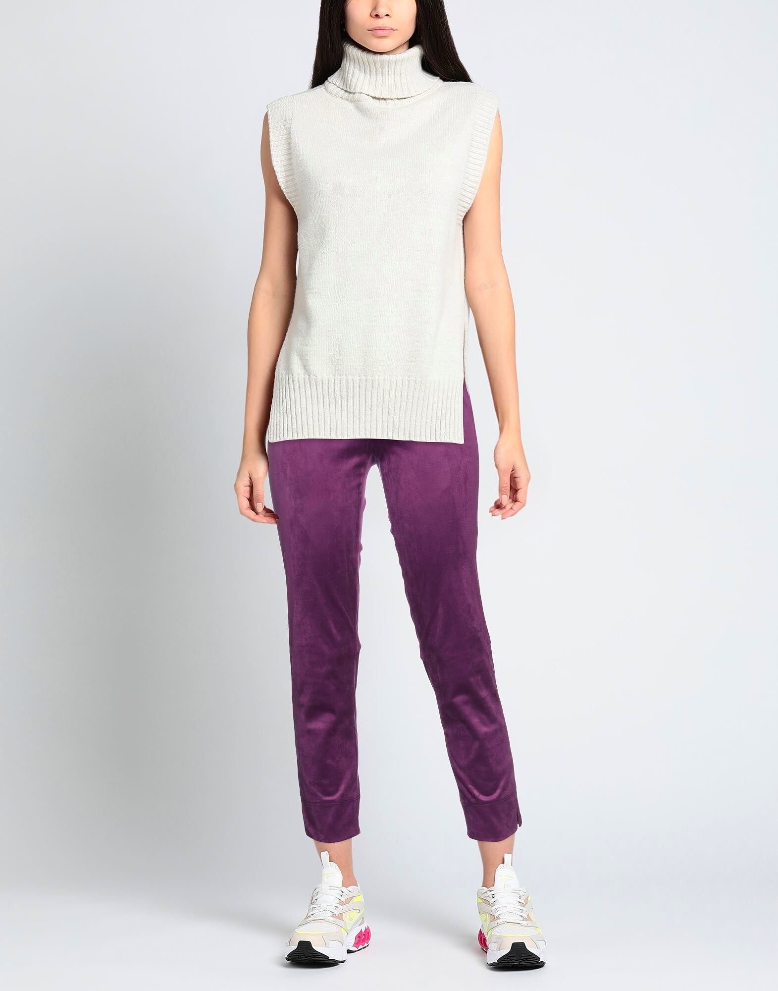 Зауженные брюки, ткань с эффектом замши, однотонные, без аппликаций, высокая талия, облегающий крой, боковой разрез по низу, без карманов, эластичные, машинная стирка или химчистка, не отбеливать, не сушить в сушилке, не гладить