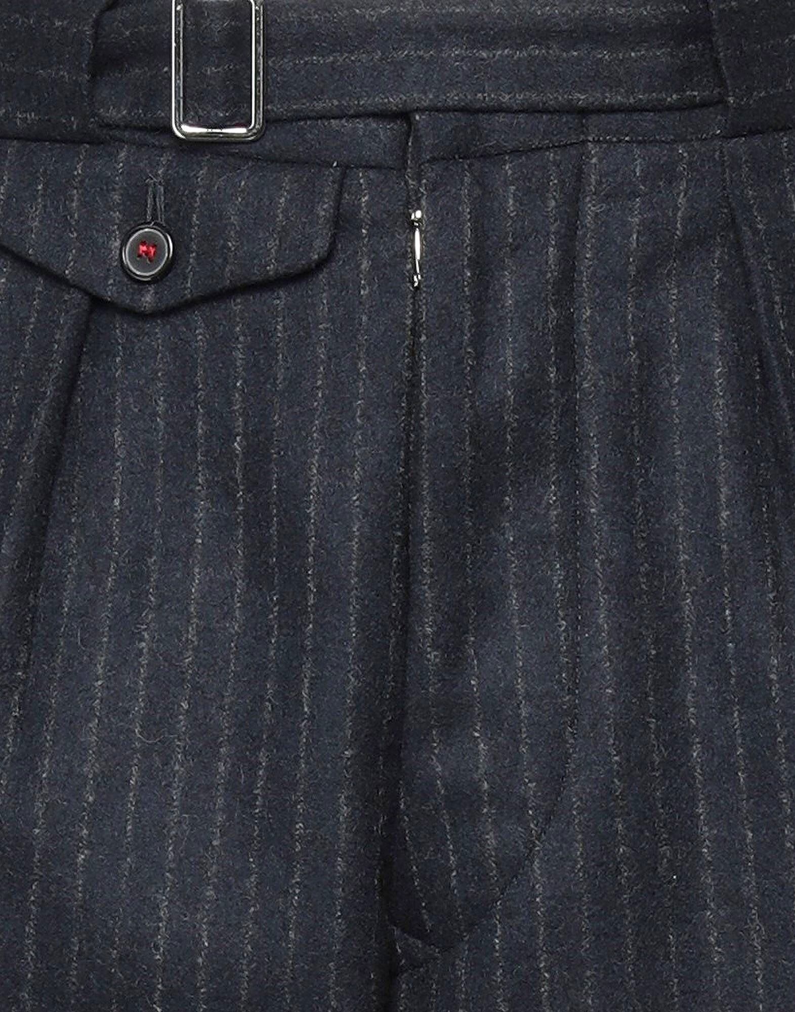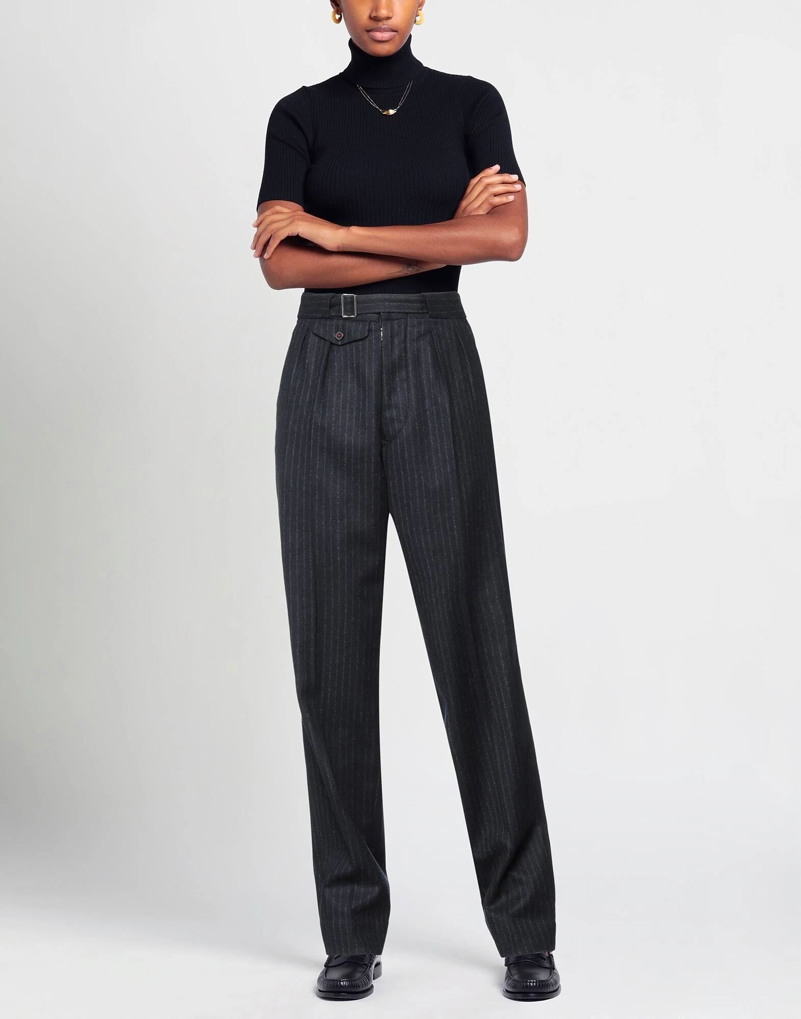 Содержит нетекстильные части животного происхождения, фланель, без аппликаций, в тонкую полоску, с высокой талией, зауженными штанинами, стандартного кроя, застежка на крючки и петли, застежка на пуговицы, множество карманов, приталенный крой