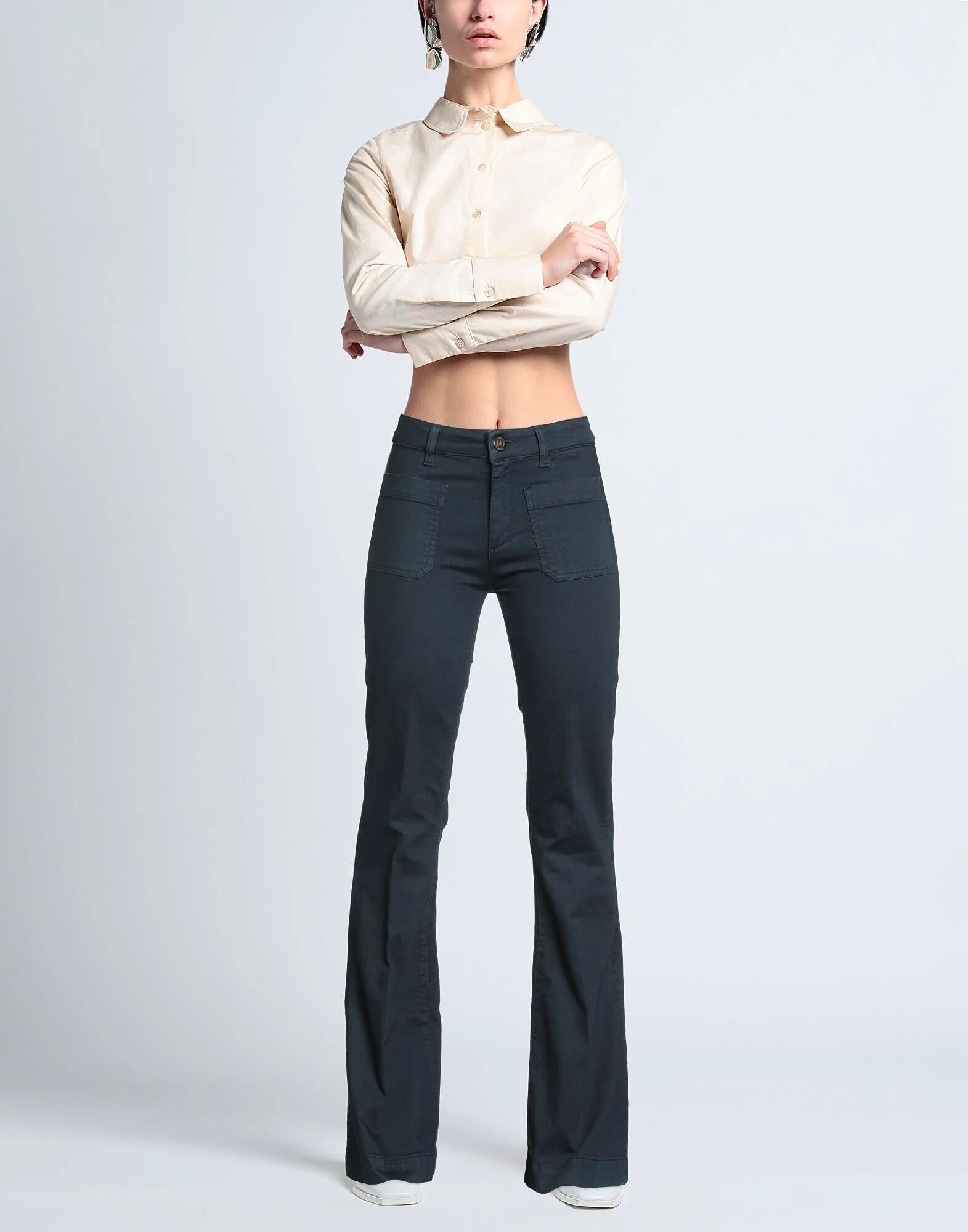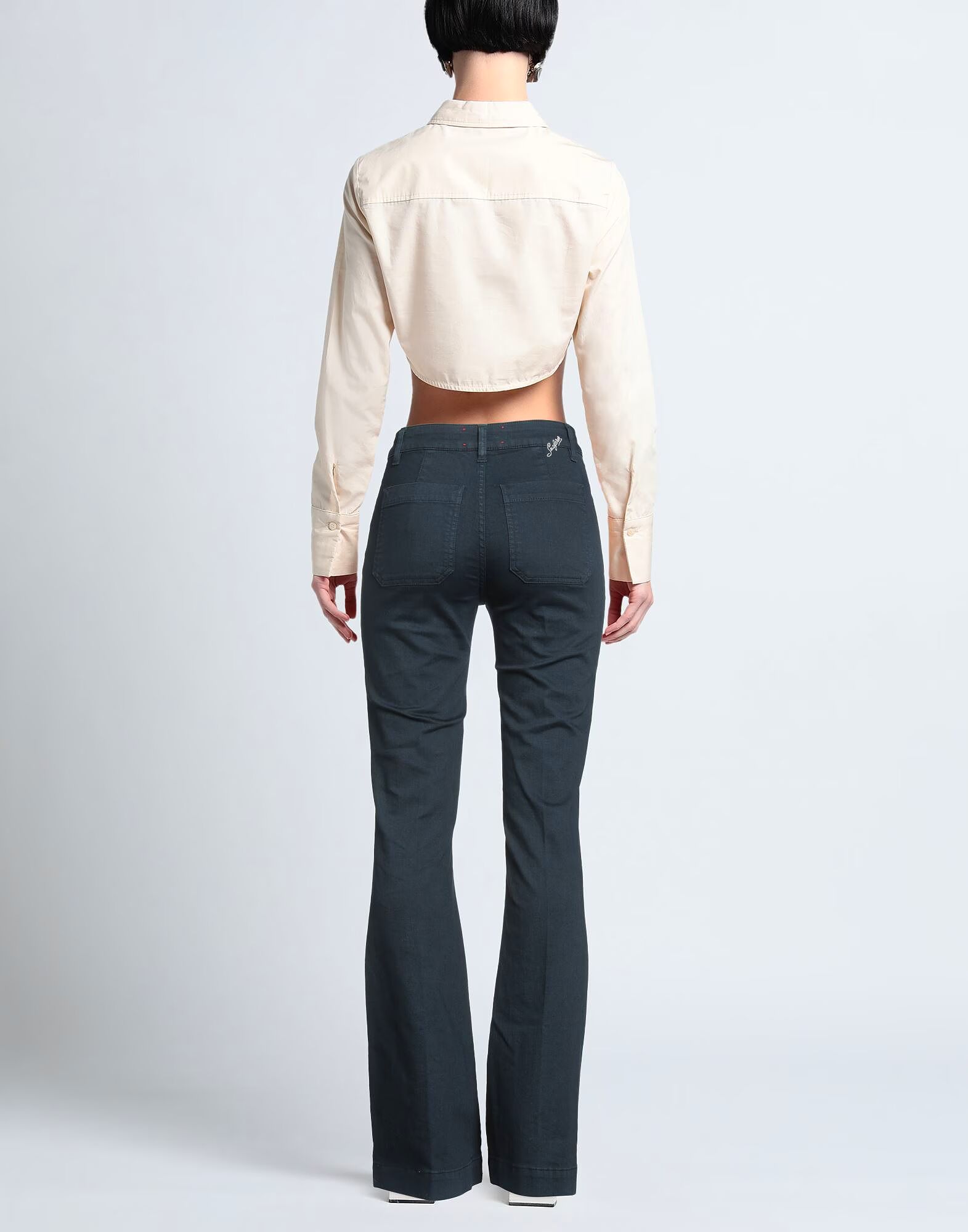 Расклешенные джинсы, деним, эластичная ткань, однотонный цвет, вышитый логотип, цветная стирка, высокая талия, стандартный крой, застежка на молнию, застежка на пуговицы, накладные карманы, машинная стирка или химчистка, не отбеливать, не сушить в сушильной машине