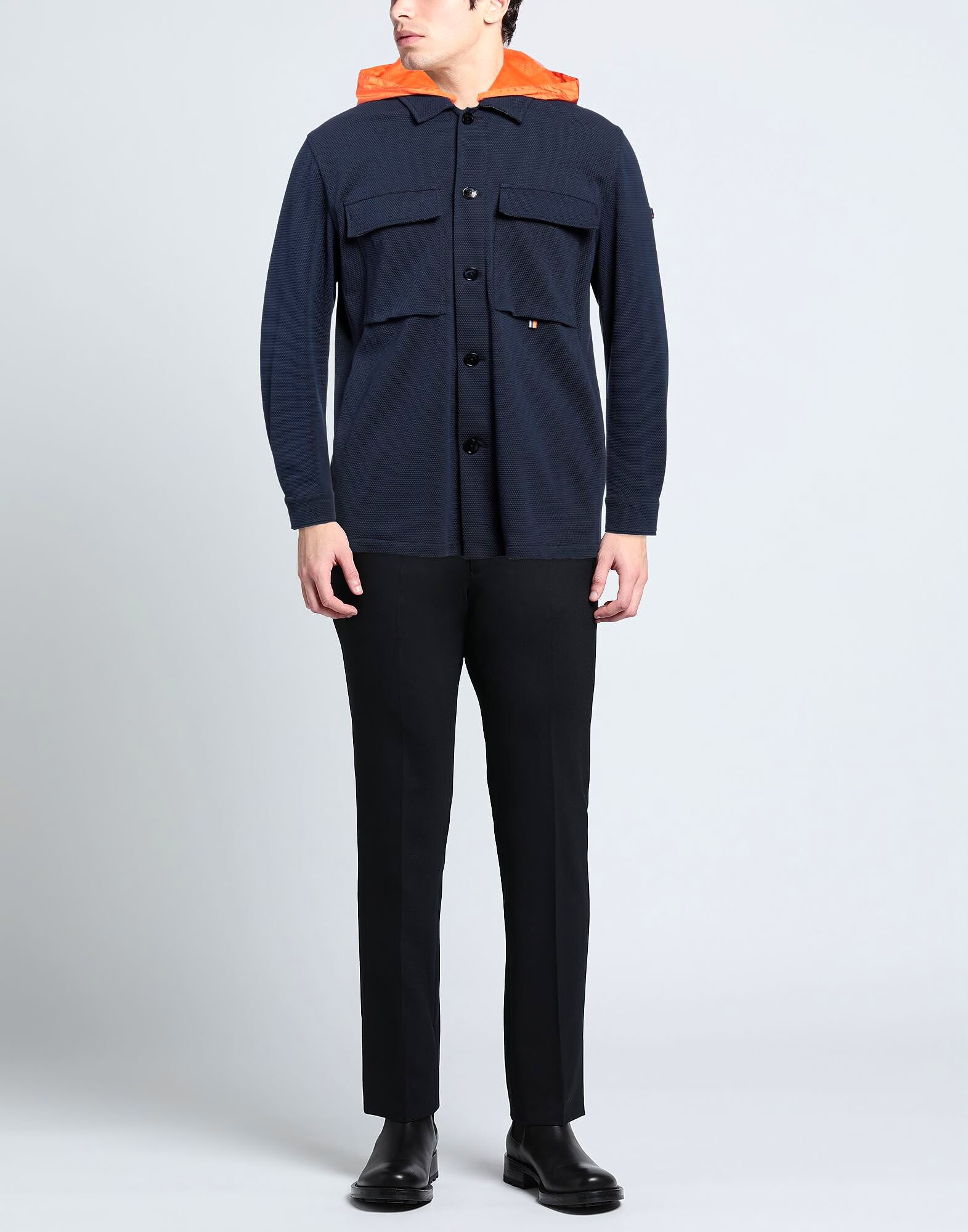 Рубашка-куртка, трикотажная, с логотипом бренда, двухцветная, со съемным капюшоном, длинные рукава, без подкладки, застежка на пуговицы, два нагрудных кармана, эластичная ткань, химчистка, не отбеливать, не сушить в сушильной машине