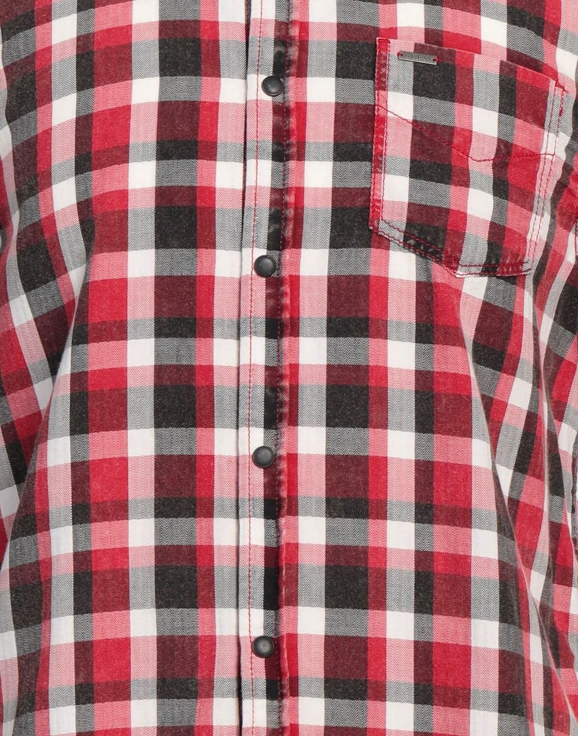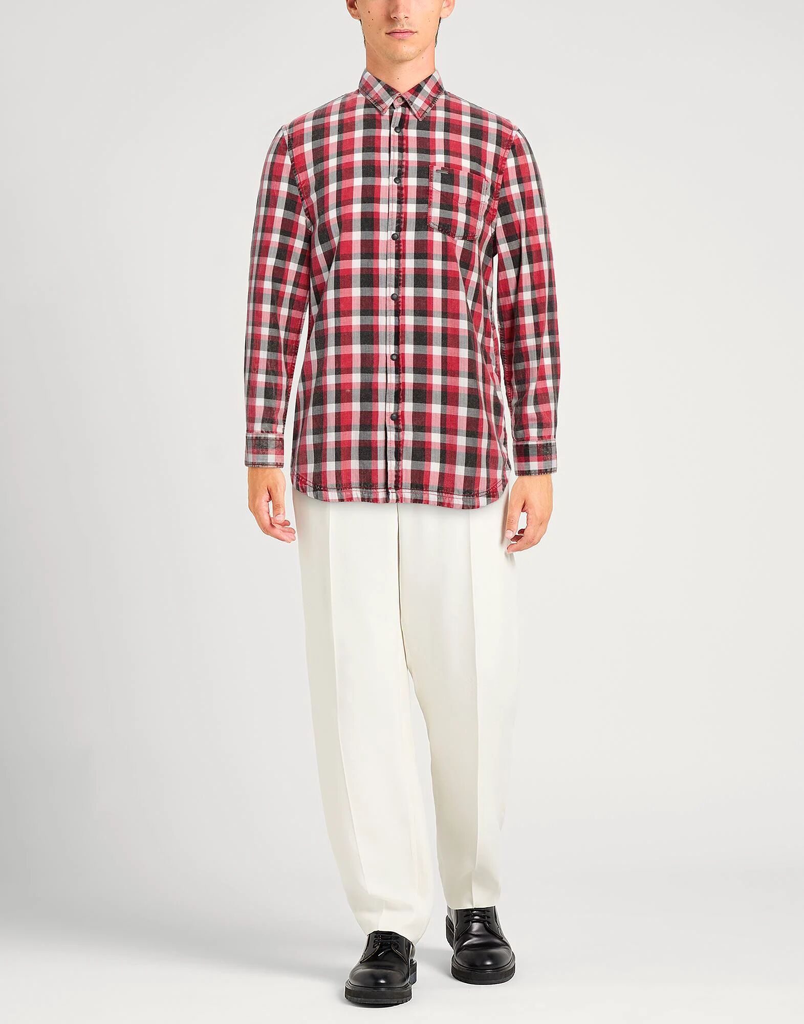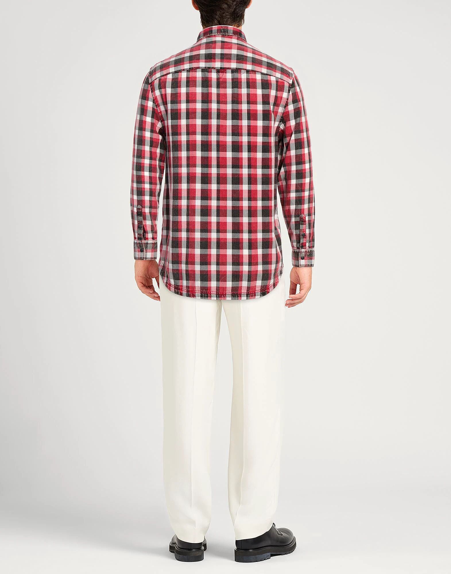 Рубашка стандартного кроя, тканая, с эффектом потертости, клетчатый узор, логотип бренда, классический воротник, длинные рукава, манжеты на кнопках, застежки на кнопках, один нагрудный карман, машинная стирка, не отбеливать, не сушить в сушильной машине