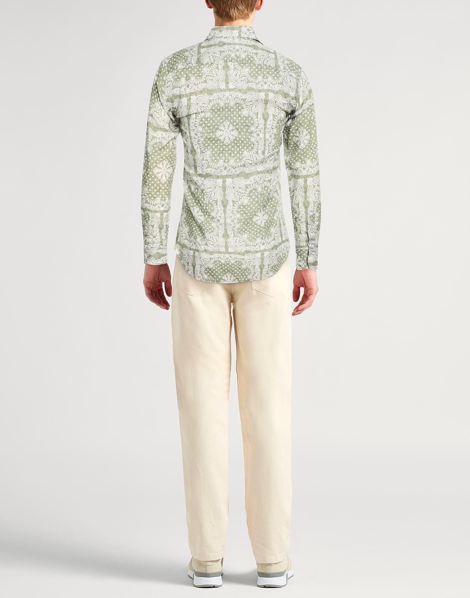 Рубашка приталенного кроя, лен, узор «пейсли», без аппликаций, классический воротник, длинные рукава, манжеты на пуговицах, застежка на пуговицы, машинная стирка, не отбеливать, сушить в сушилке, эта марка маломерит