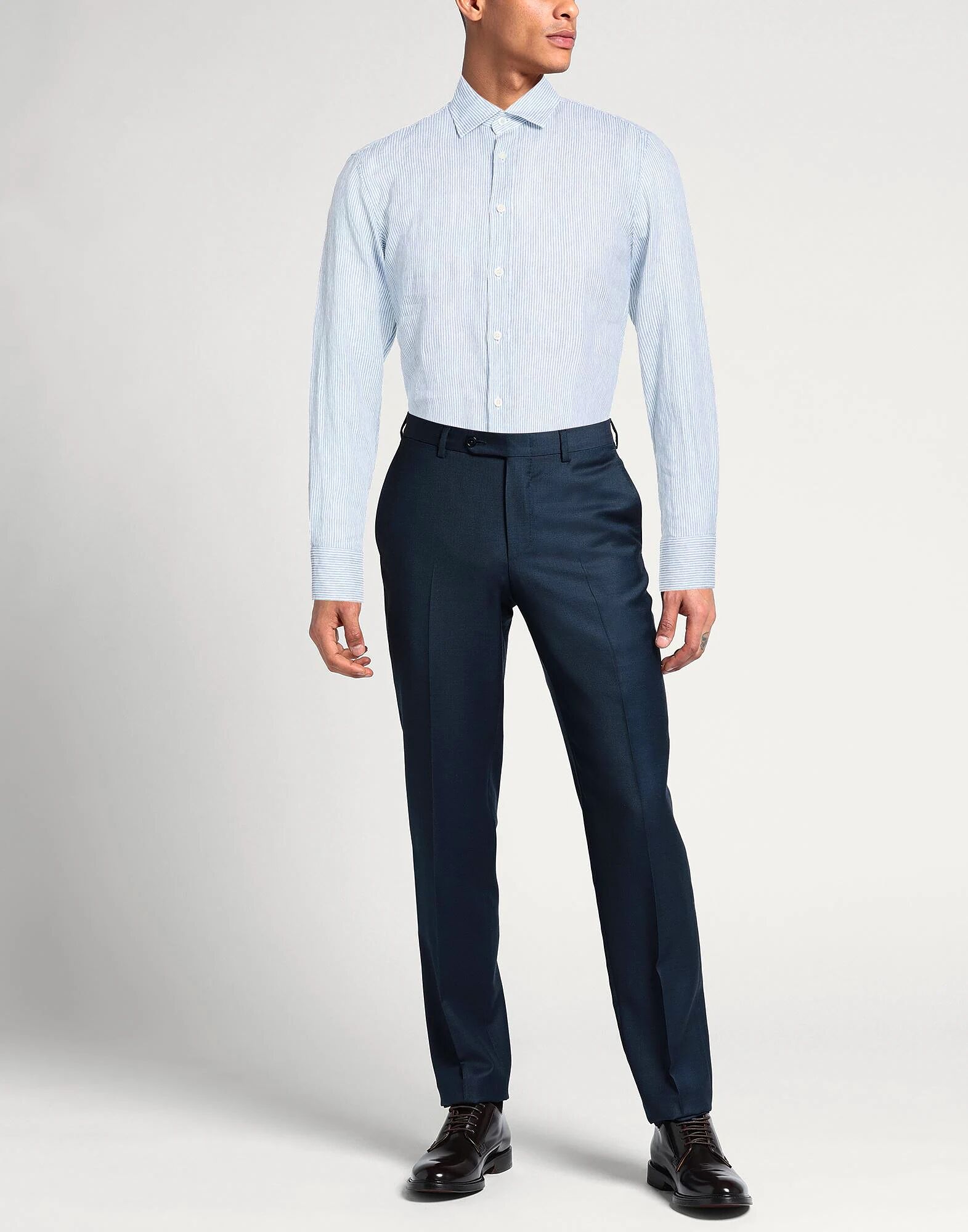 Рубашка приталенного кроя, тканая, в полоску, без аппликаций, классический воротник, длинные рукава, застежка на пуговицы, машинная стирка или химчистка, не отбеливать, не сушить в сушильной машине