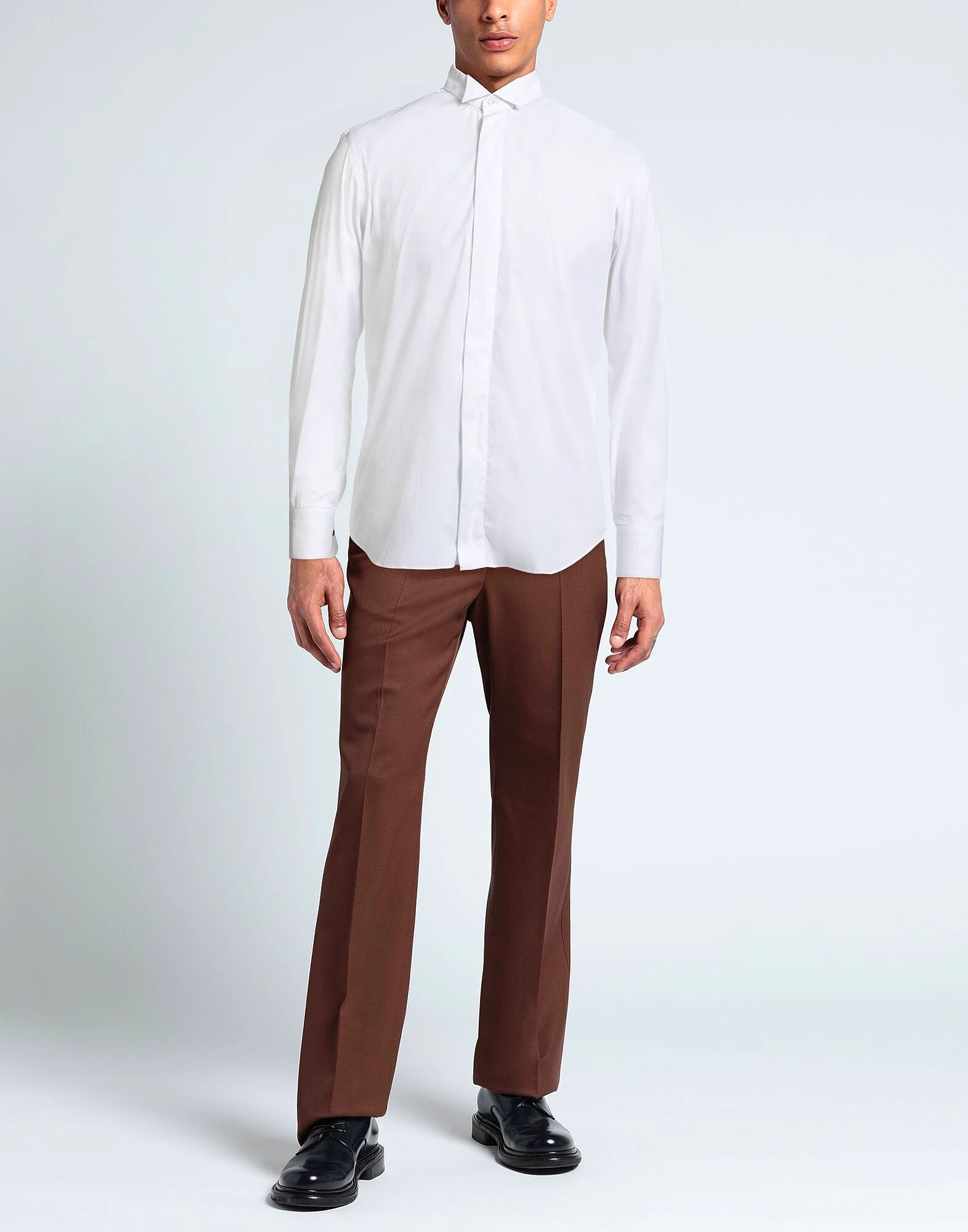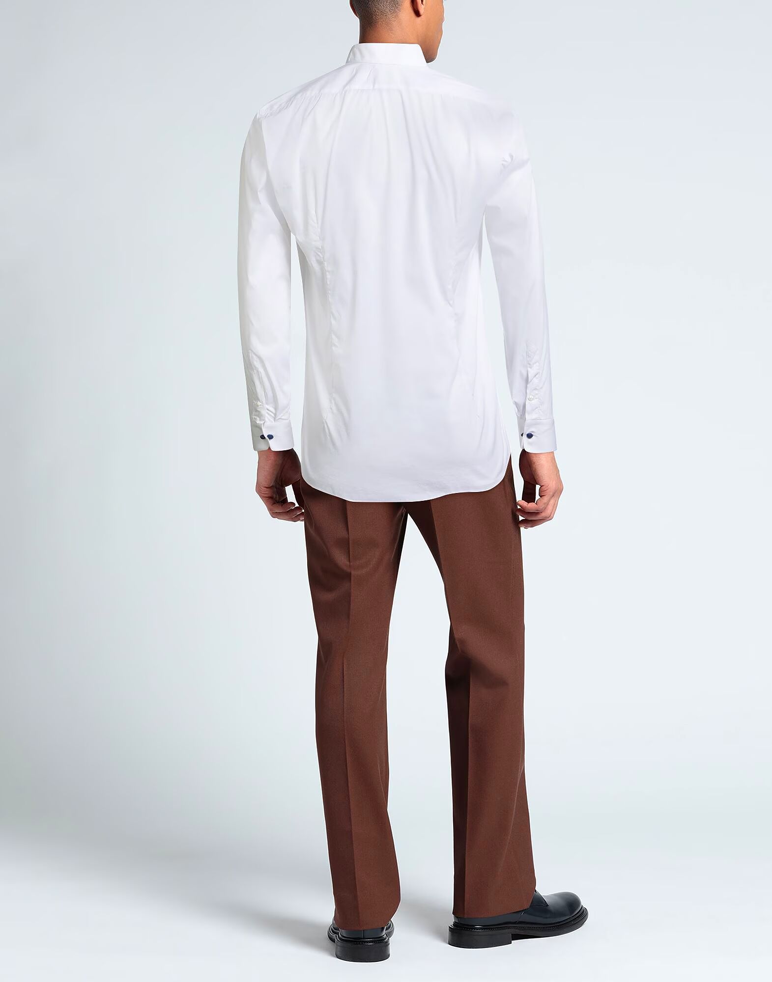 Рубашка стандартного кроя, тканая, однотонная, без аппликаций, воротник-стойка, длинные рукава, манжеты на пуговицах, застежка на пуговицы, эластичная, машинная стирка, не отбеливать, не сушить в сушильной машине