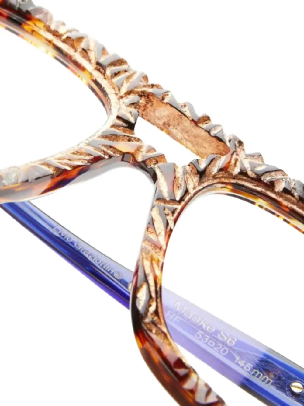 Коричневая резная оправа, геометрическая форма, носоупоры, прямые заушники, изогнутые кончики. Эти очки поставляются с защитным футляром. Все очки на FARFETCH продаются как оправа без диоптрий.