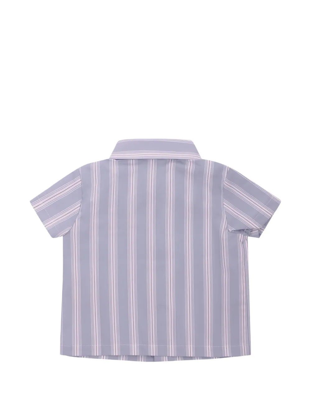 Синий с вертикальной полоской, вышитый логотип, короткие рукава, застежка на пуговицы, воротник