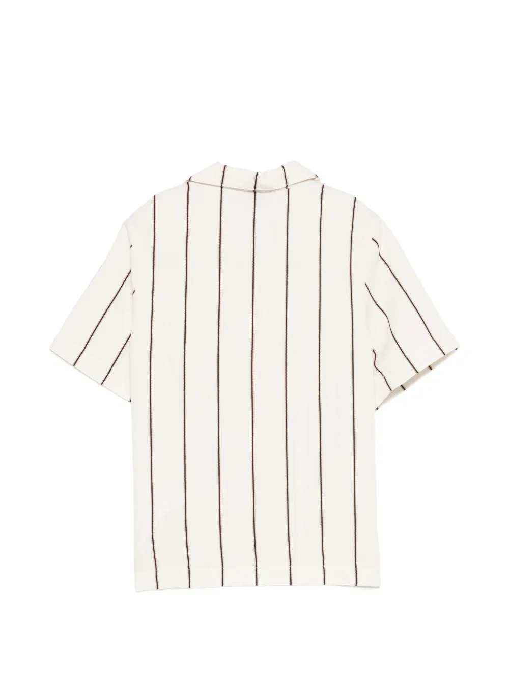 Светло-бежевый в полоску, застежка на пуговицы, короткие рукава, отложной воротник, логотип на груди