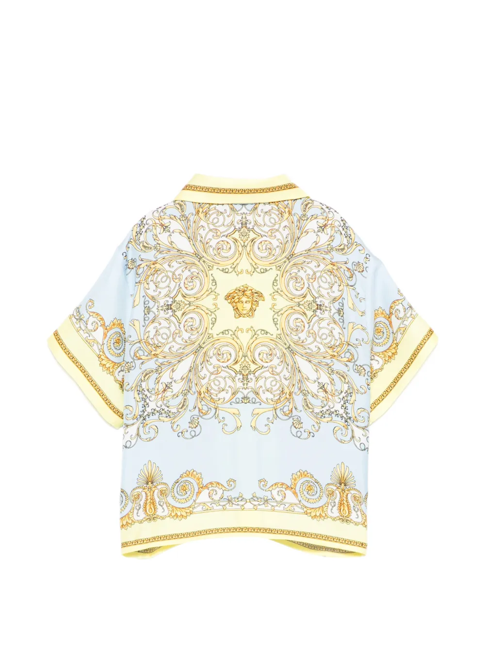 Светло-голубая и желтая барочная принтованная рубашка с застежкой на пуговицы, короткими рукавами, отложным воротником и украшением в виде цепочки