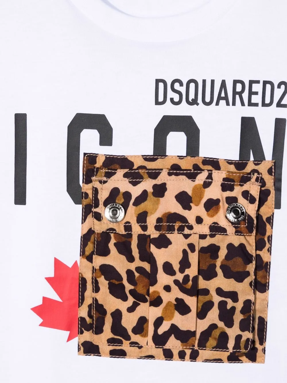 Логотип спереди, круглый вырез, короткие рукава, прямой подол, леопардовый принт и карман на пуговице.